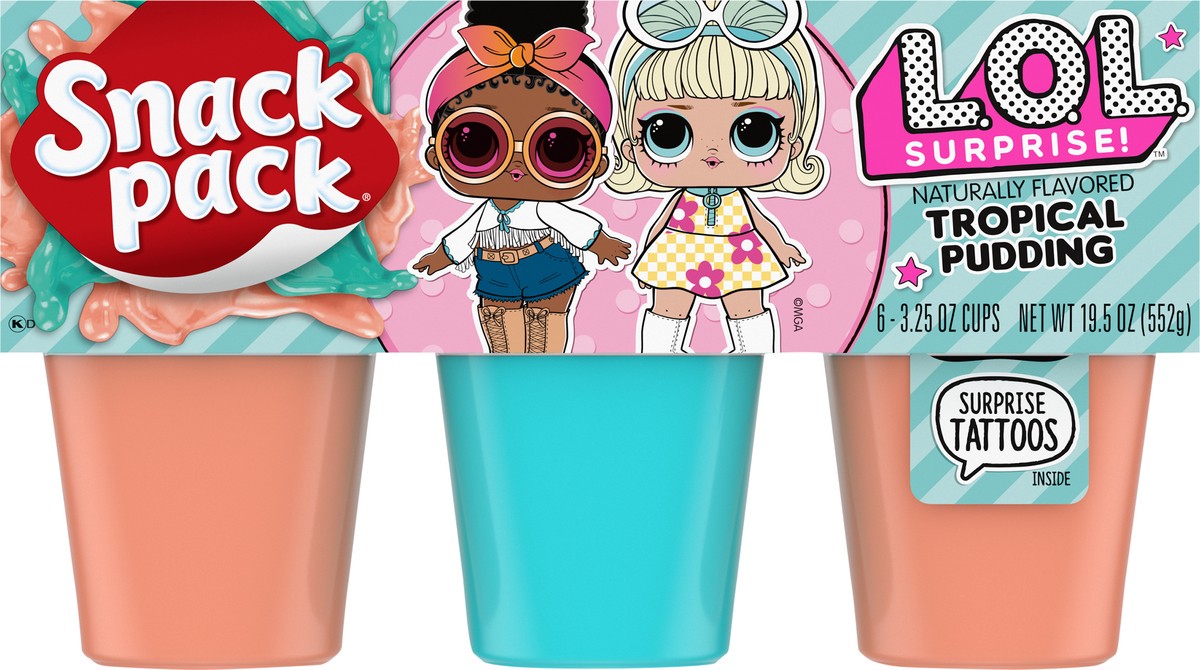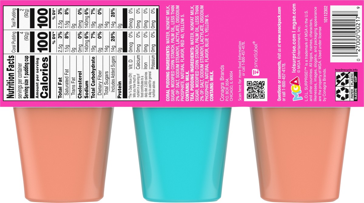 Teal Pudding: Water, Nonfat Milk, Sugar, Modified Corn Starch, Palm Oil, Less than 2% of: Salt, Sodium Stearoyl Lactylate, Disodium Phosphate, Natural Flavor, Blue 1, Yellow 5. Coral Pudding: Water, N…
