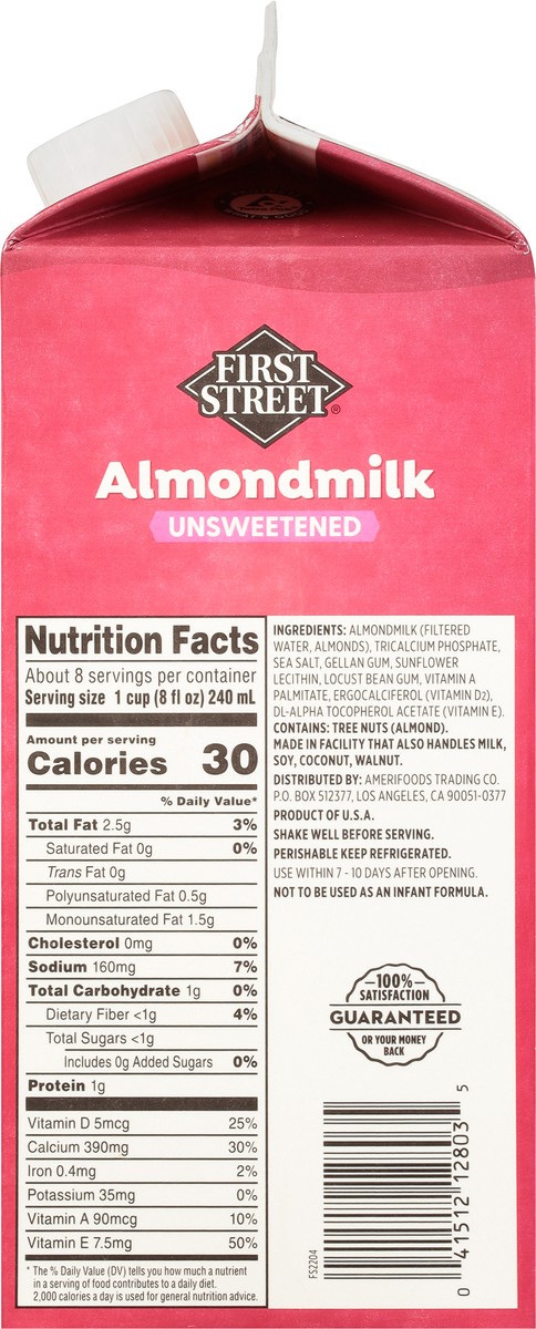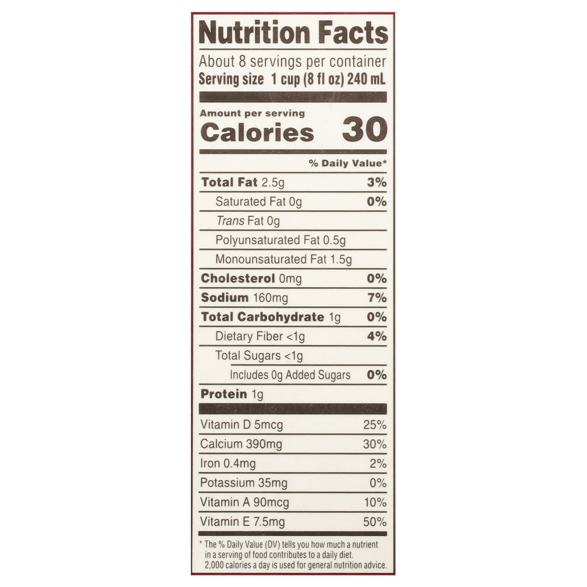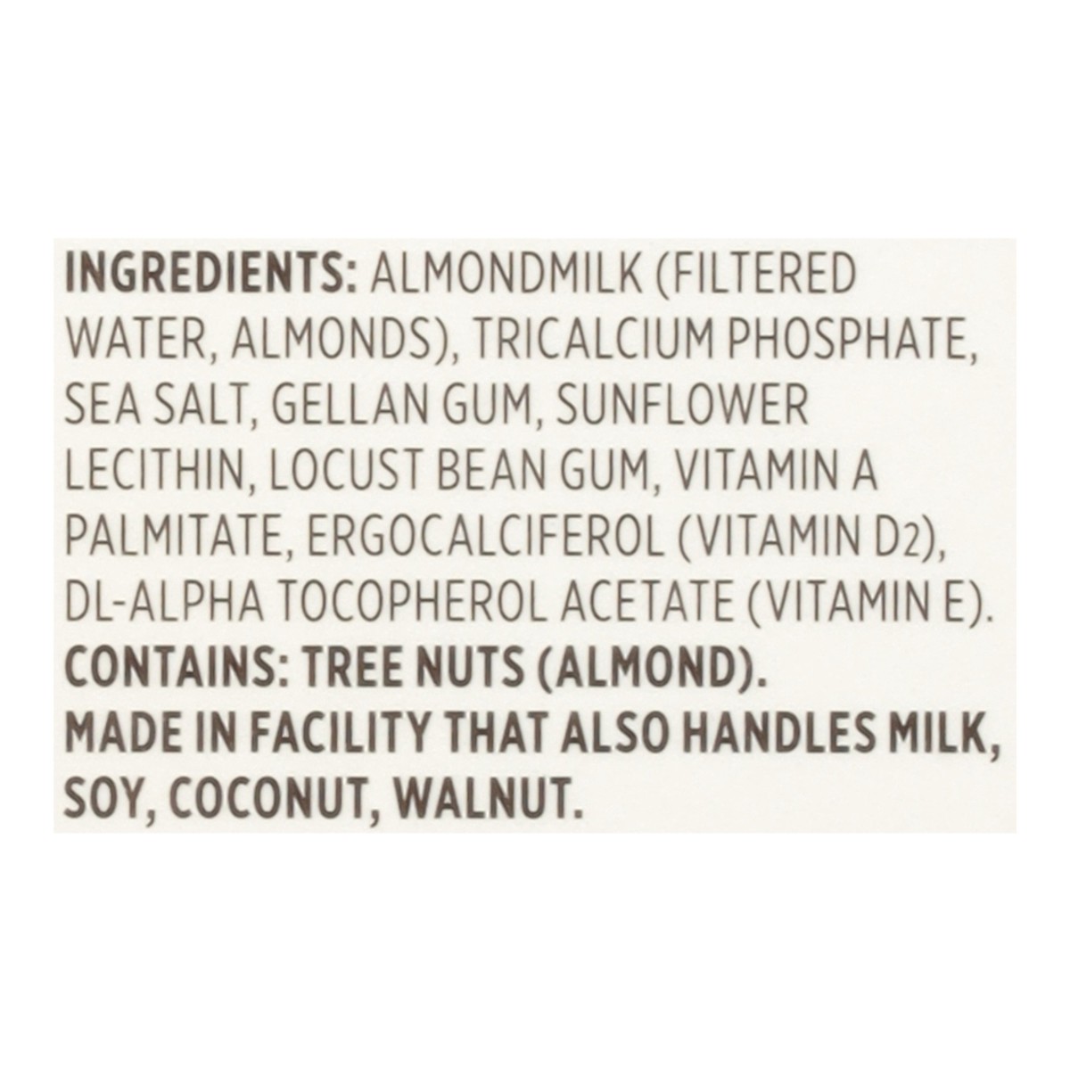 Almondmilk (Filtered Water, Almonds), Tricalcium Phosphate, Sea Salt, Gellan Gum, Sunflower Lecithin, Locust Bean Gum, Vitamin a Palmitate, Ergocalciferol (Vitamin D2), DL-Alpha Tocopherol Acetate (Vi…