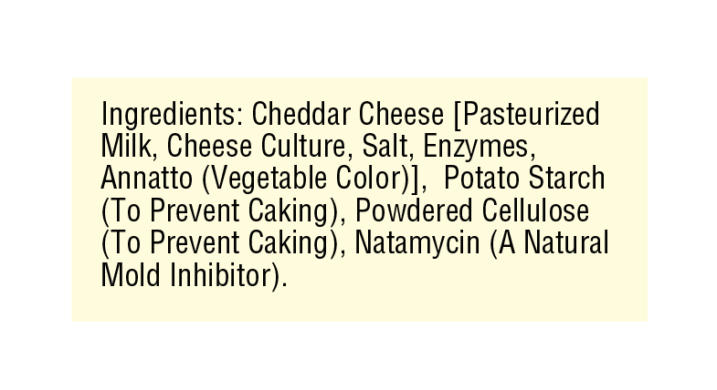 CHEDDAR CHEESE [PASTEURIZED MILK, CHEESE CULTURE, SALT, ENZYMES, ANNATTO (VEGETABLE COLOR)], POTATO STARCH AND POWDERED CELLULOSE (TO PREVENT CAKING), NATAMYCIN (A NATURAL MOLD INHIBITOR).