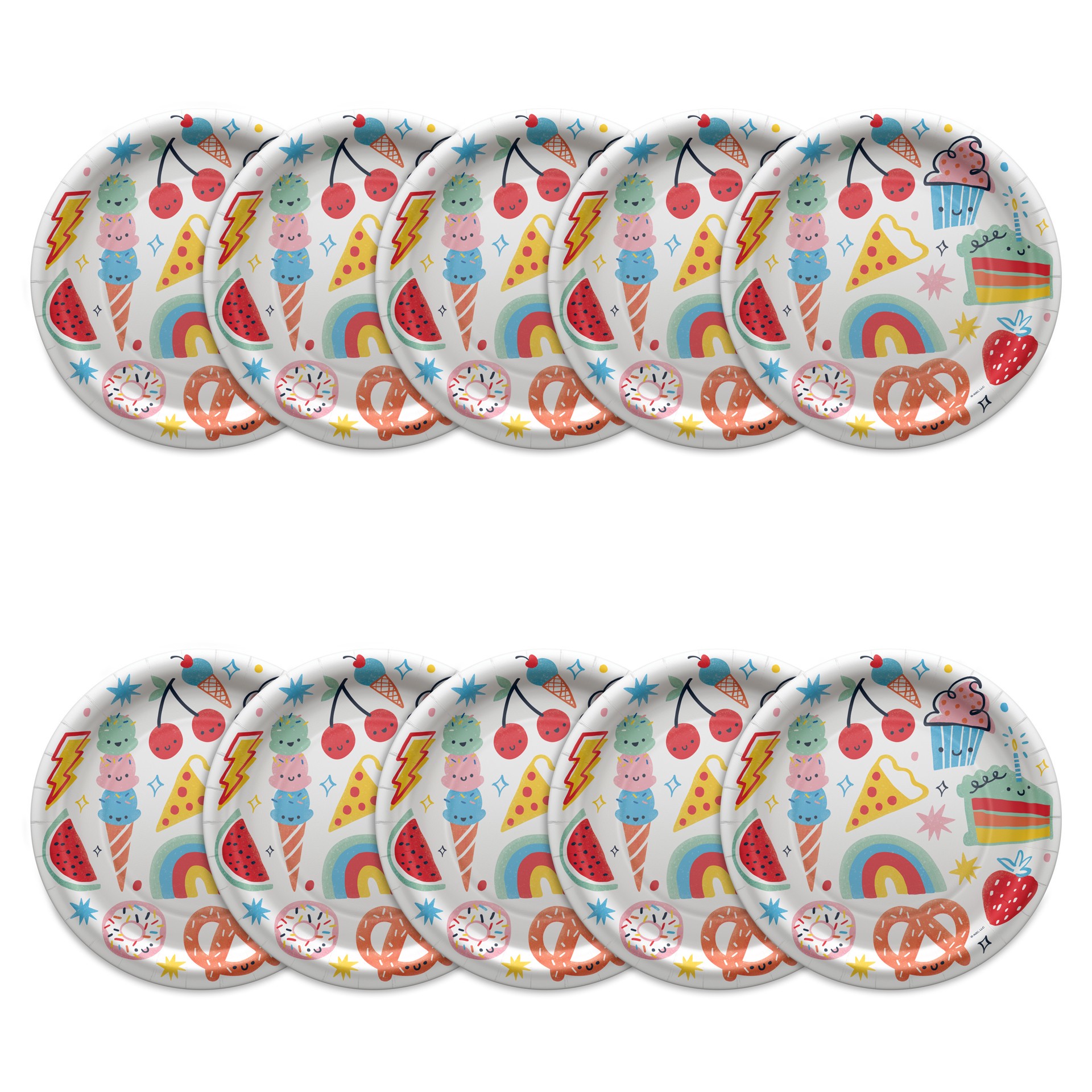 Get any picnic or party off to a happy start with these bright and fun paper plates! Sold in a pack of 10, the whimsical art features assorted foods and colorful treats. The 9-inch size makes the plat…