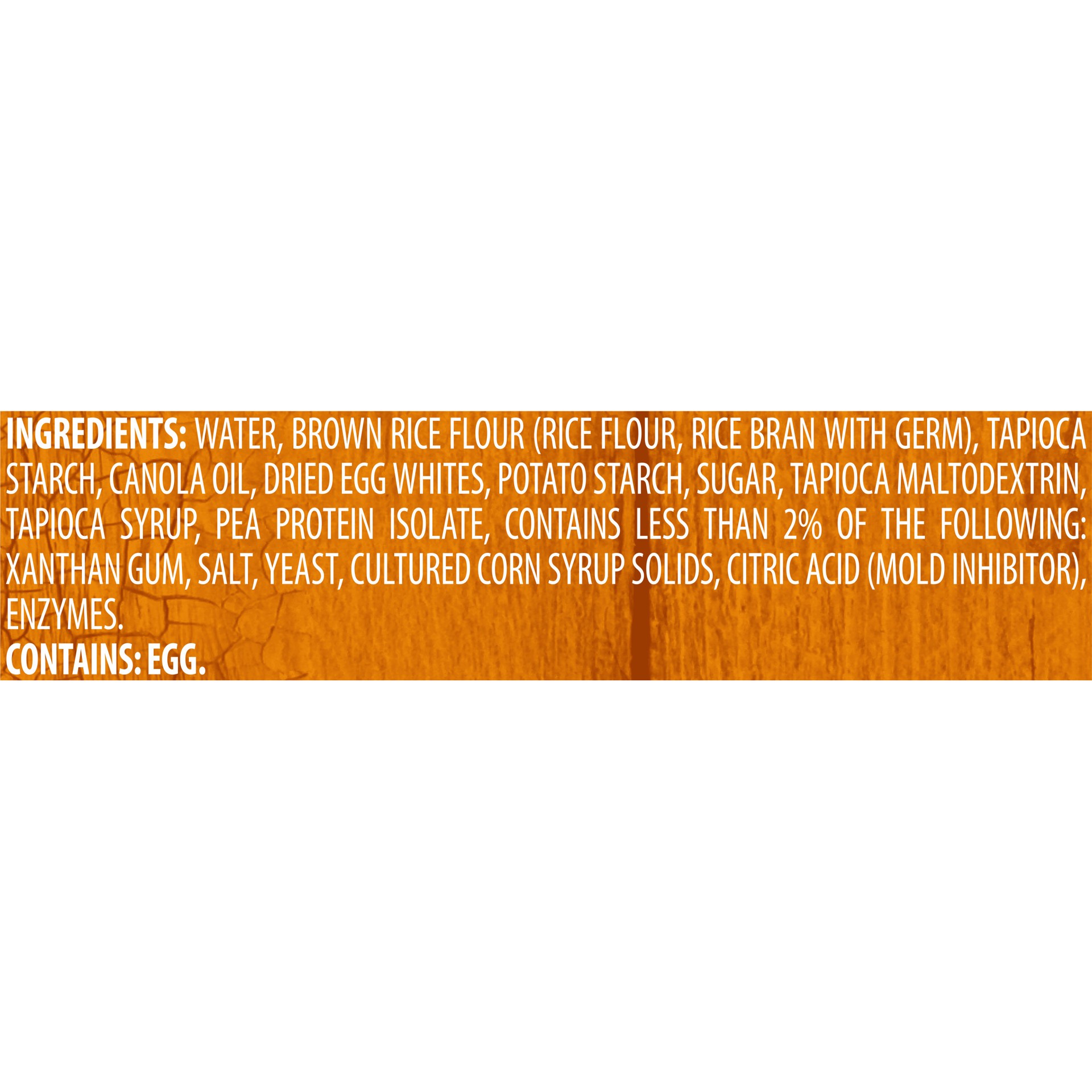 INGREDIENTS: WATER, BROWN RICE FLOUR (RICE FLOUR, RICE BRAN WITH GERM), TAPIOCA STARCH, CANOLA OIL, EGG WHITES, POTATO STARCH, CANE SUGAR, TAPIOCA MALTODEXTRIN, TAPIOCA SYRUP, PEA PROTEIN, XANTHAN GUM…