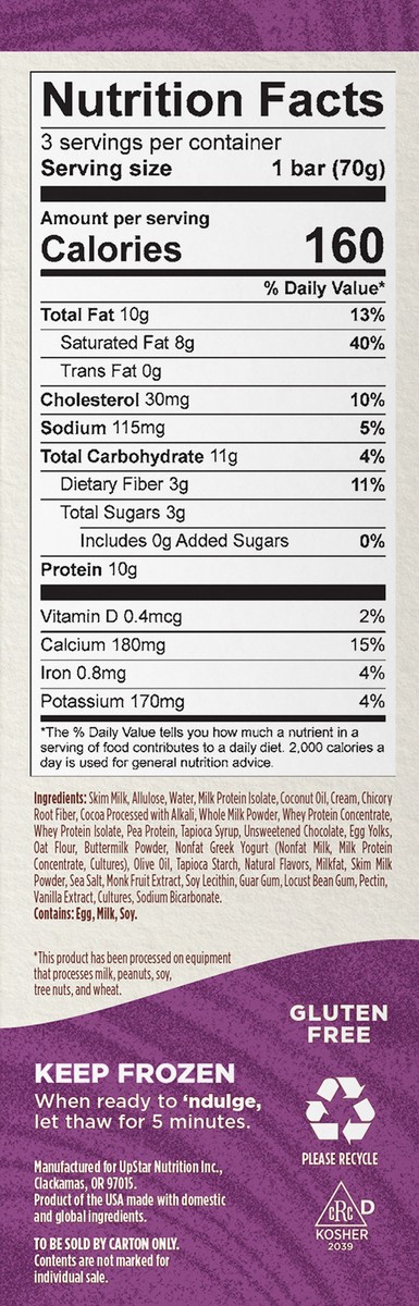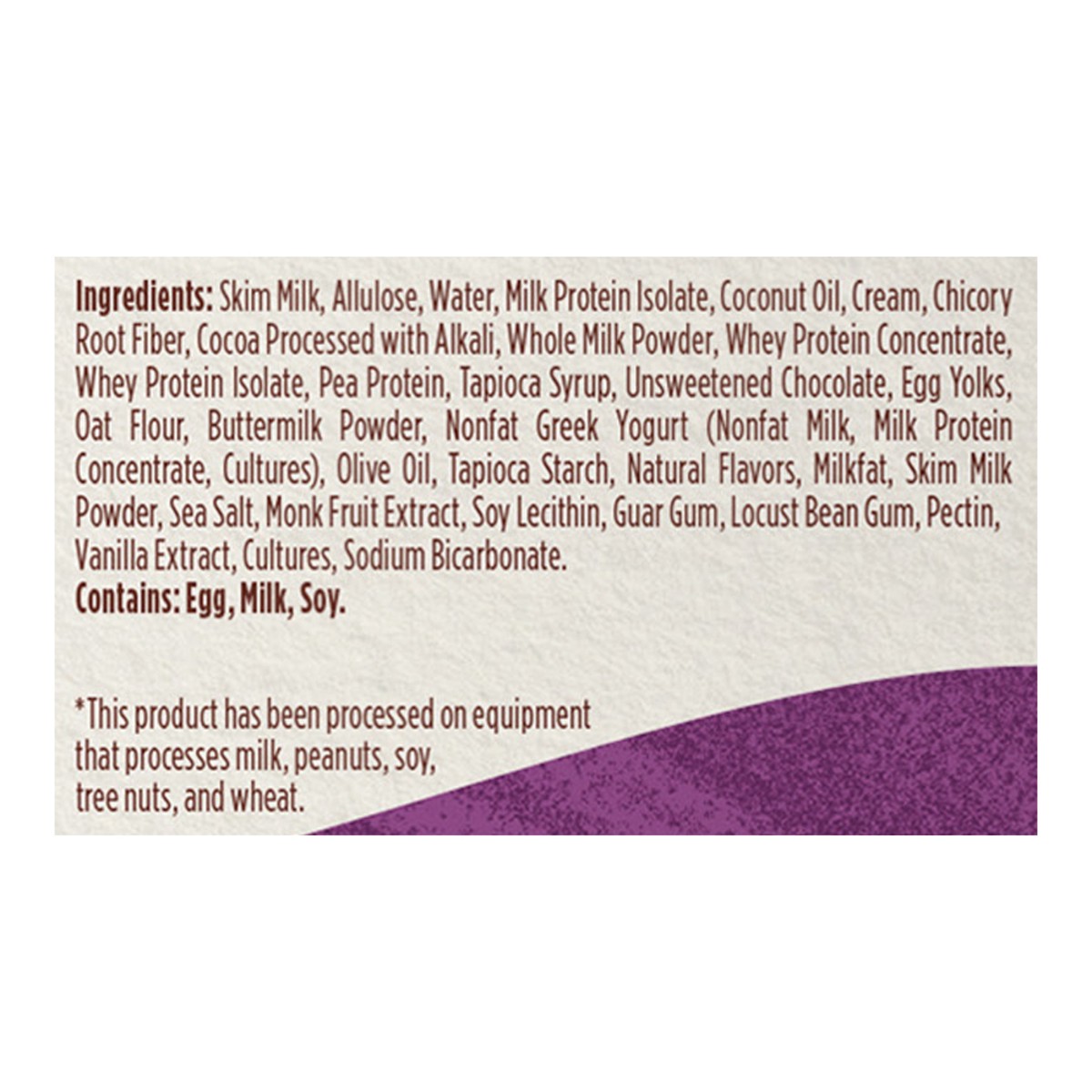 Skim Milk, Allulose, Water, Milk Protein Isolate, Coconut Oil, Cream, Chicory Root Fiber, Cocoa Processed with Alkali, Whole Milk Powder, Whey Protein Concentrate, Whey Protein Isolate, Pea Protein, T…
