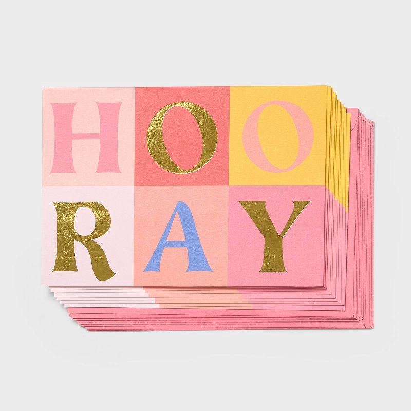 Share your thoughts or emotions using this 10ct Hooray Cards - Spritz™. The note cards feature the text ‘Hooray' on the front along with pink envelopes that are perfect to send anybody a special messa…