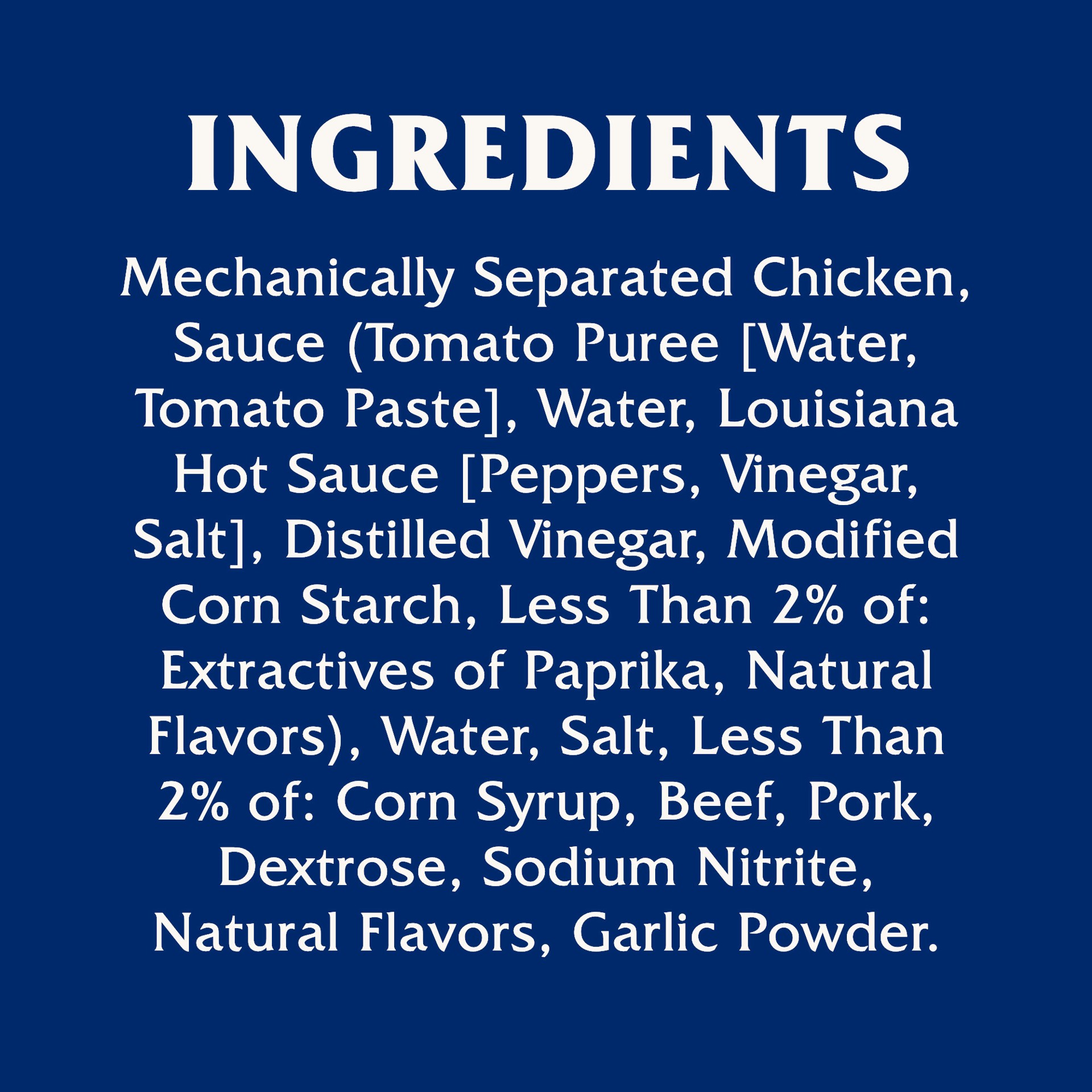 Mechanically Separated Chicken, Sauce (Tomato Puree [Water, Tomato Paste], Water, Louisiana Hot Sauce [Peppers, Vinegar, Salt], Distilled Vinegar, Modified Corn Starch, Less than 2% of: Extractives of…