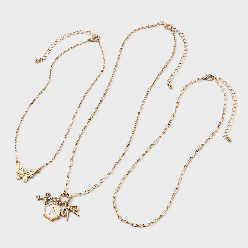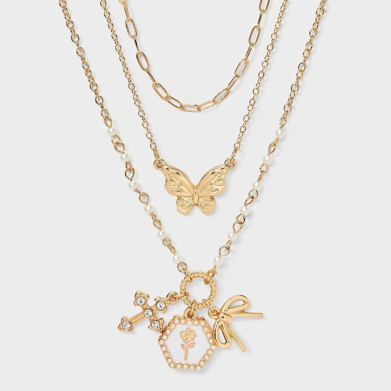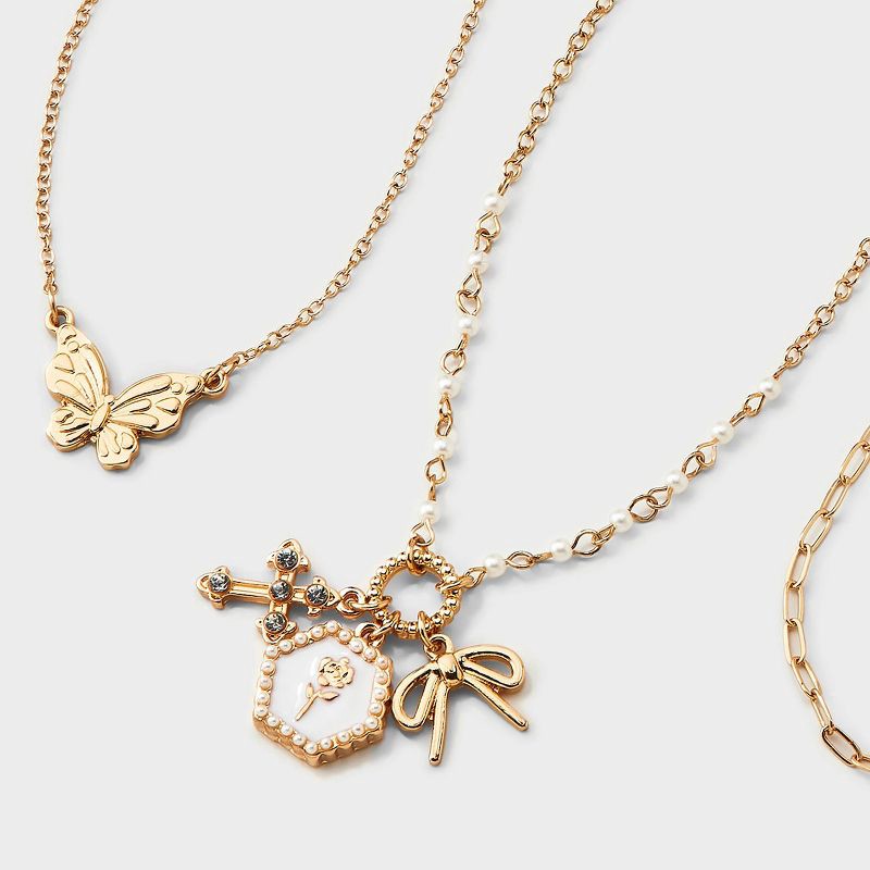 Girls' 3pk Layered Necklace Set with Butterfly Cross and Bow Charms- art class™