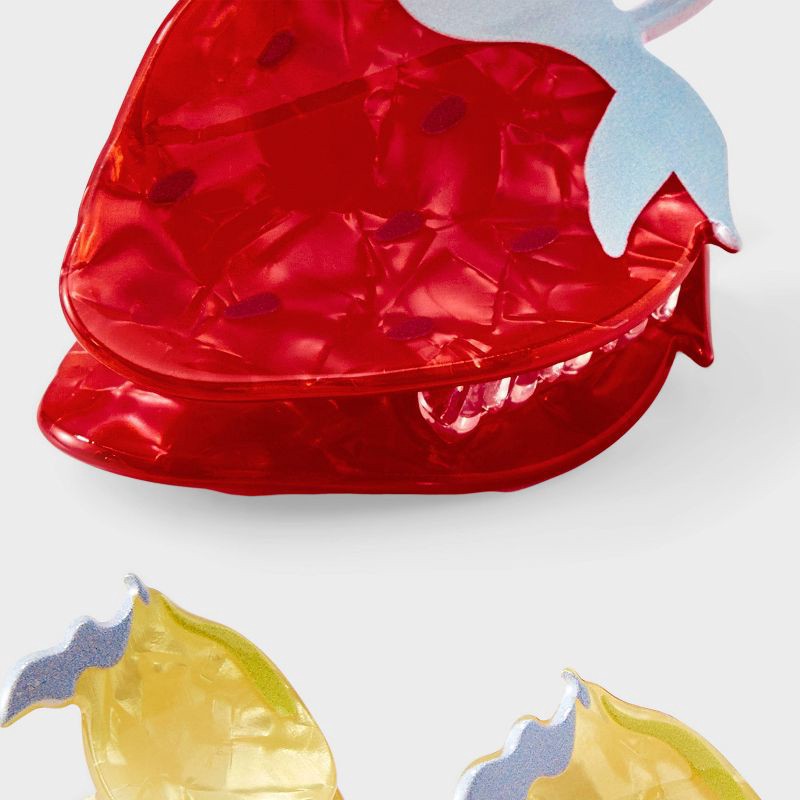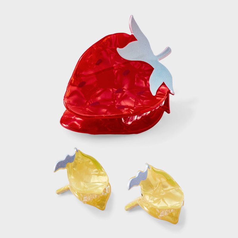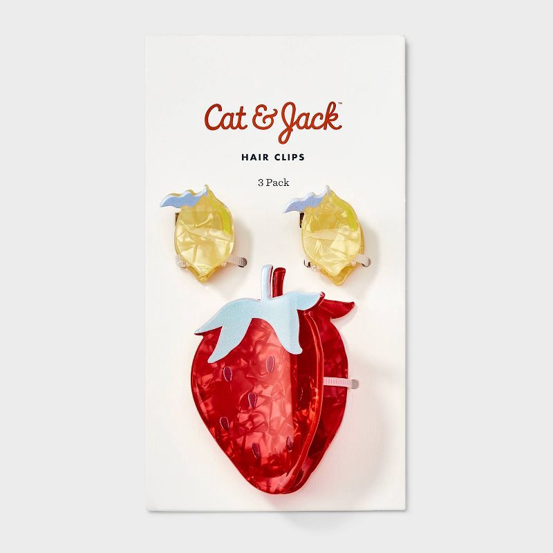 Add a playful touch to any hairstyle with the Girls' 3pk Claw Clip Set with Fruit Icons from Cat & Jack™. Designed for all hair types, these multicolored acrylic and iron clips are perfect for securin…