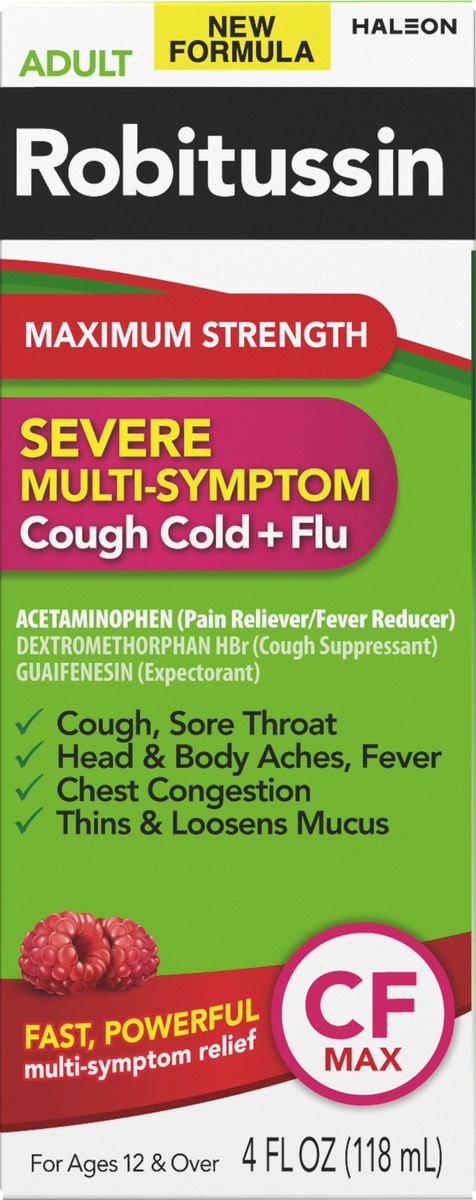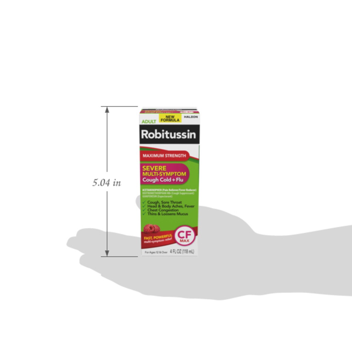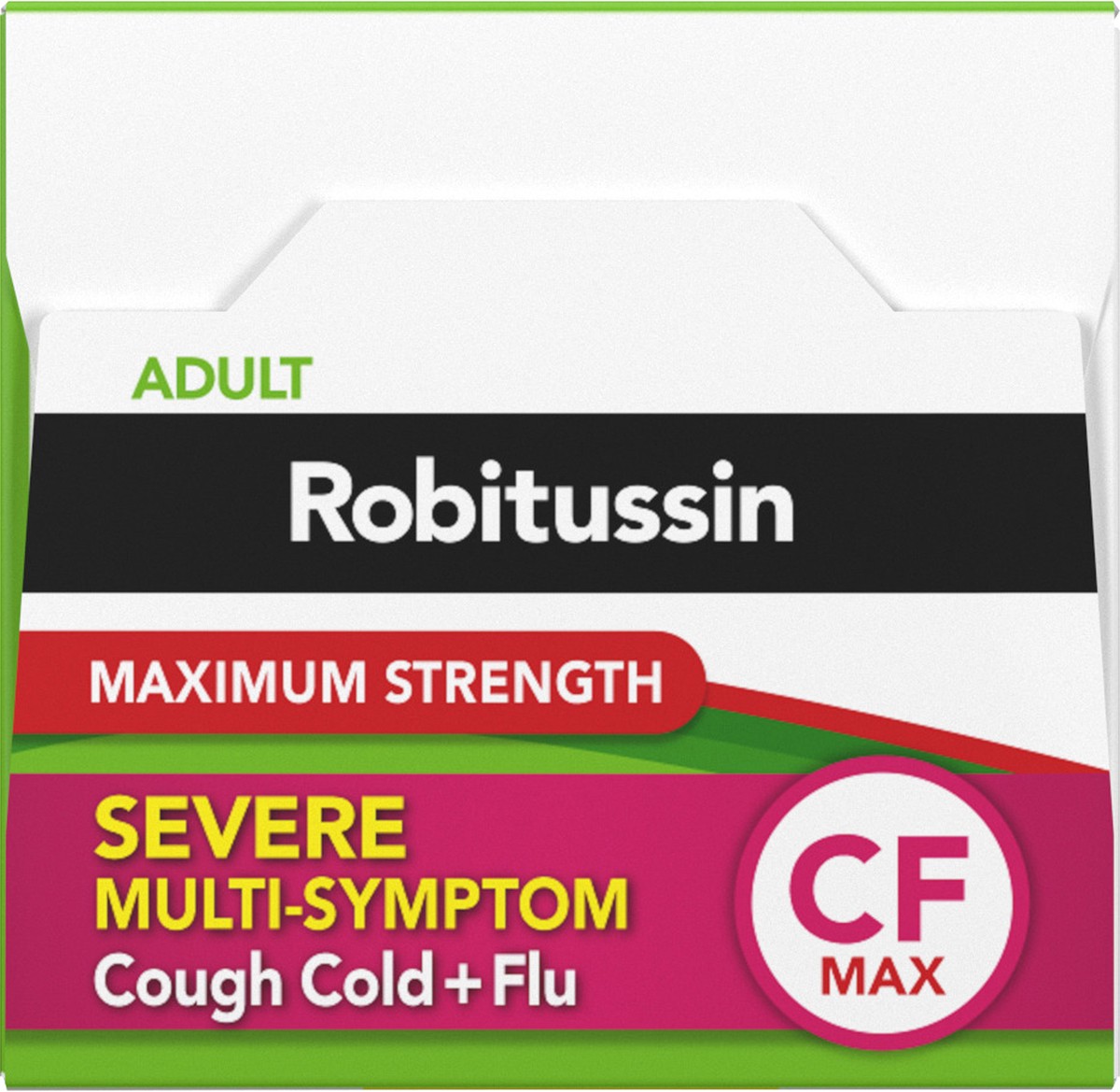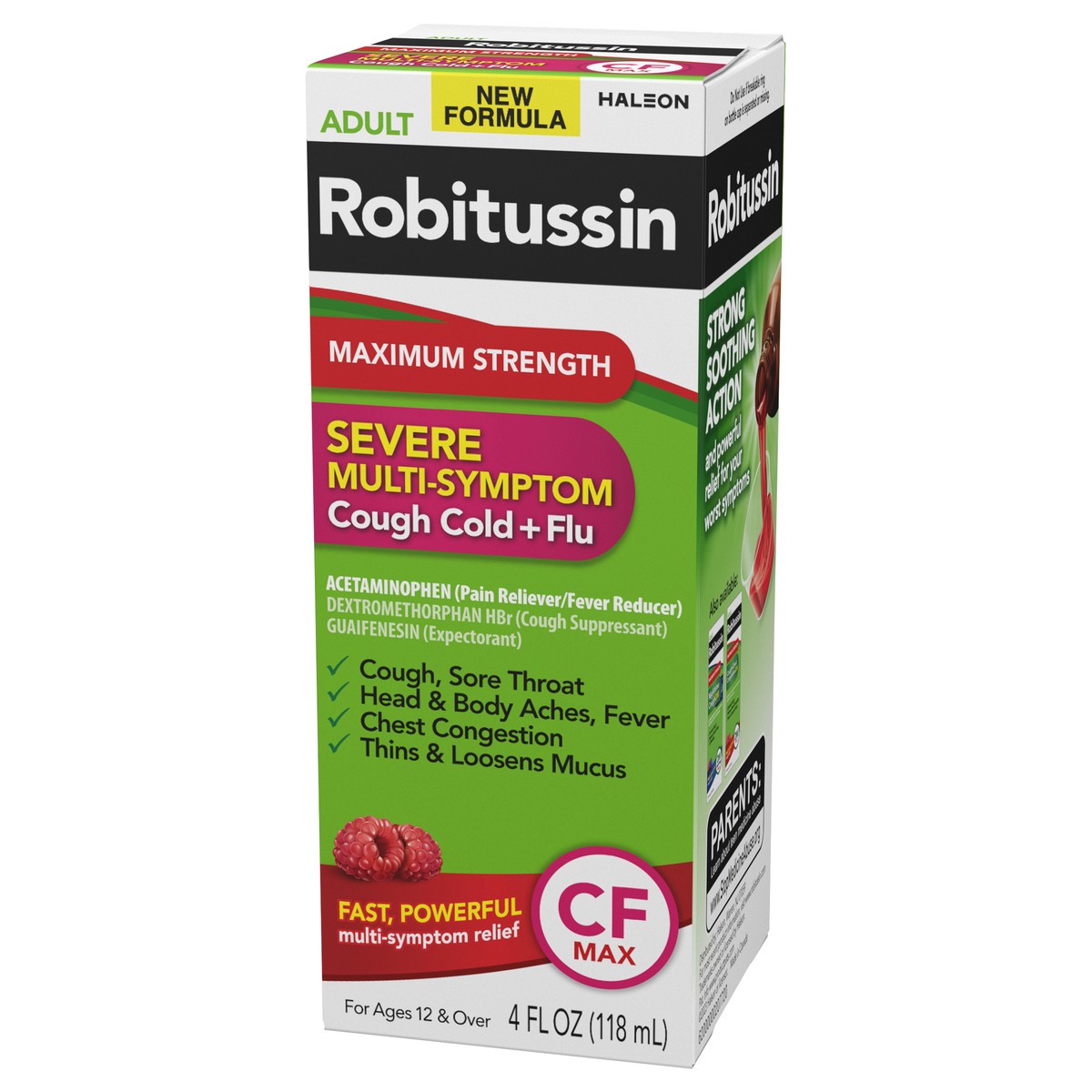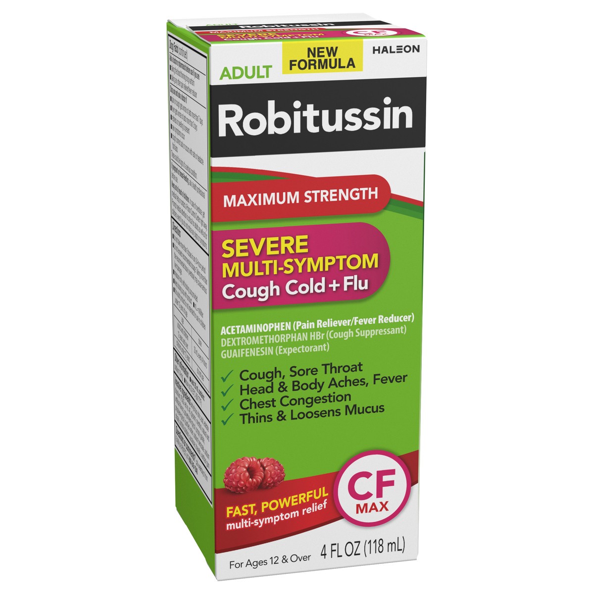 Get fast, powerful cough relief with Robitussin Adult CF Maximum Strength Severe Multi-Symptom Cough, Cold and Flu Medicine. This formula contains acetaminophen for pain and fever relief, dextromethor…