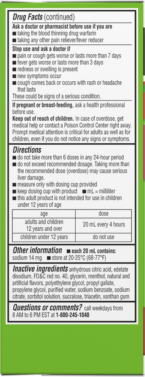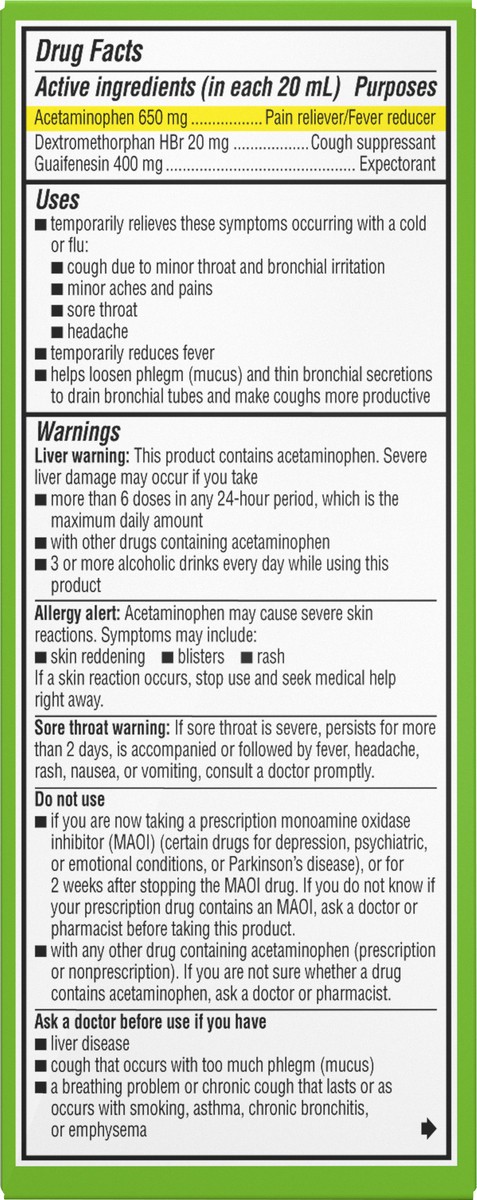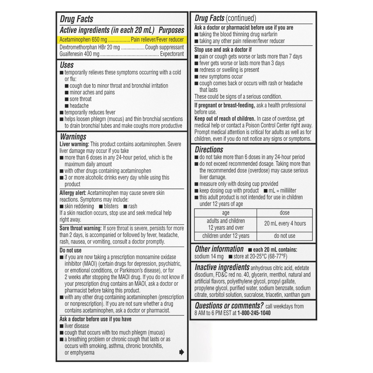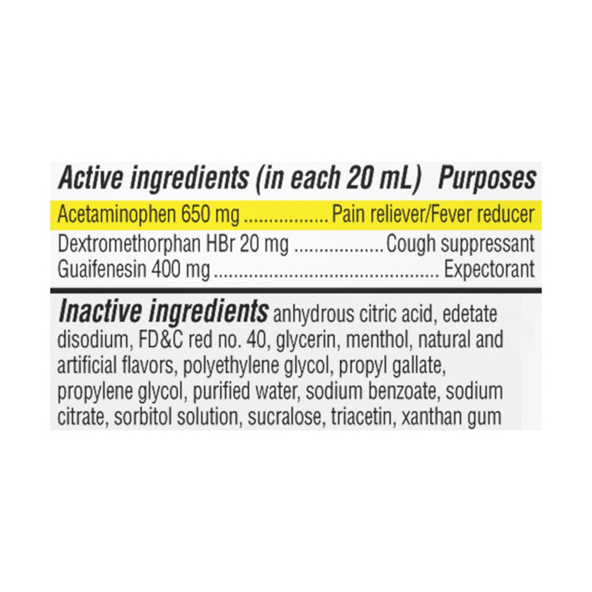 In Each 20 mL: Active Ingredients: Acetaminophen (650 mg), Pain Reliever/Fever Reducer; Dextromethorphan HBr (20 mg), Cough Suppressant; Guaifenesin (400 mg), Expectorant. Inactive Ingredients: Anhydr…