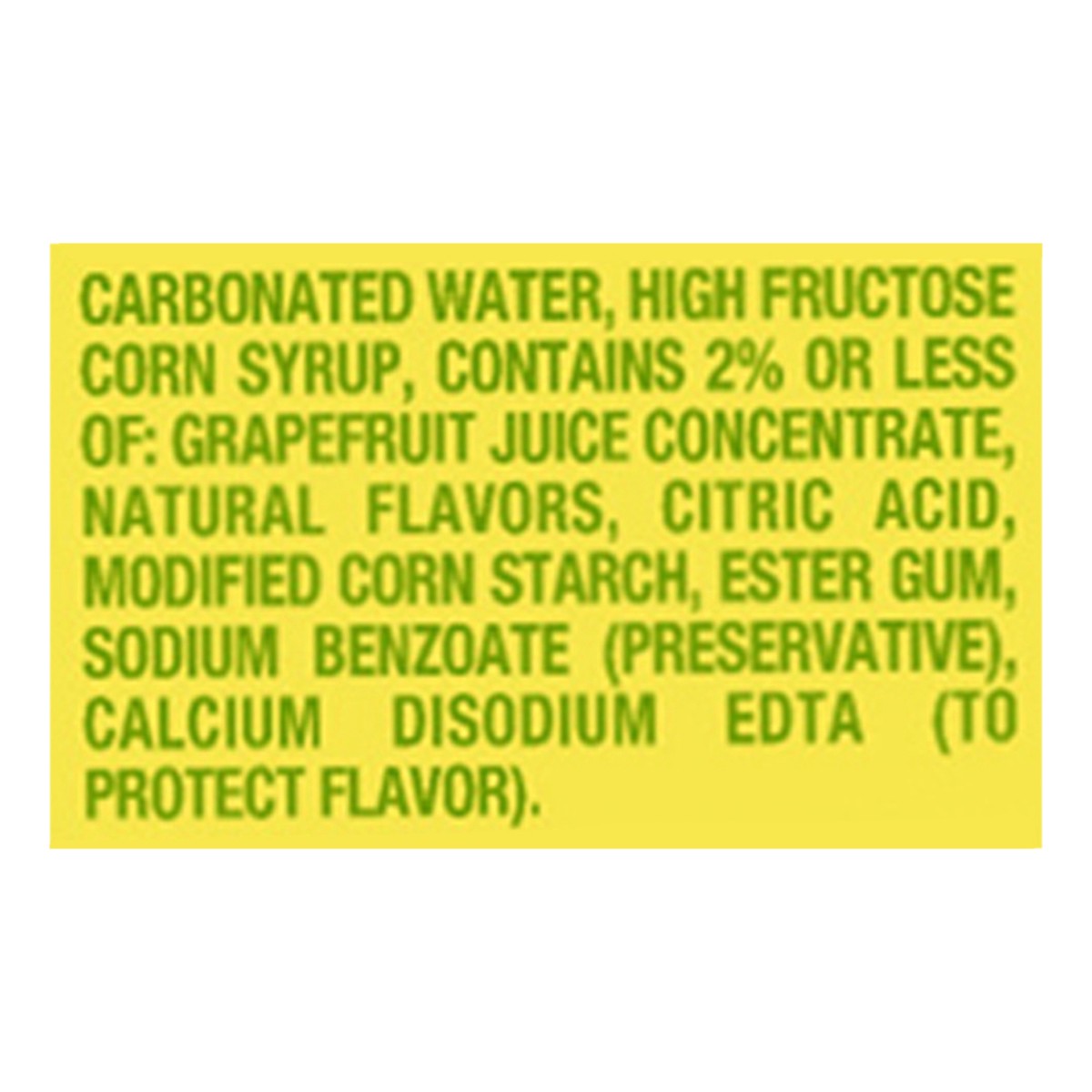 Carbonated Water, High Fructose Corn Syrup, Contains 2% or Less of: Grapefruit Juice Concentrate, Natural Flavors, Citric Acid, Modified Corn Starch, Ester Gum, Sodium Benzoate (Preservative), Calcium…