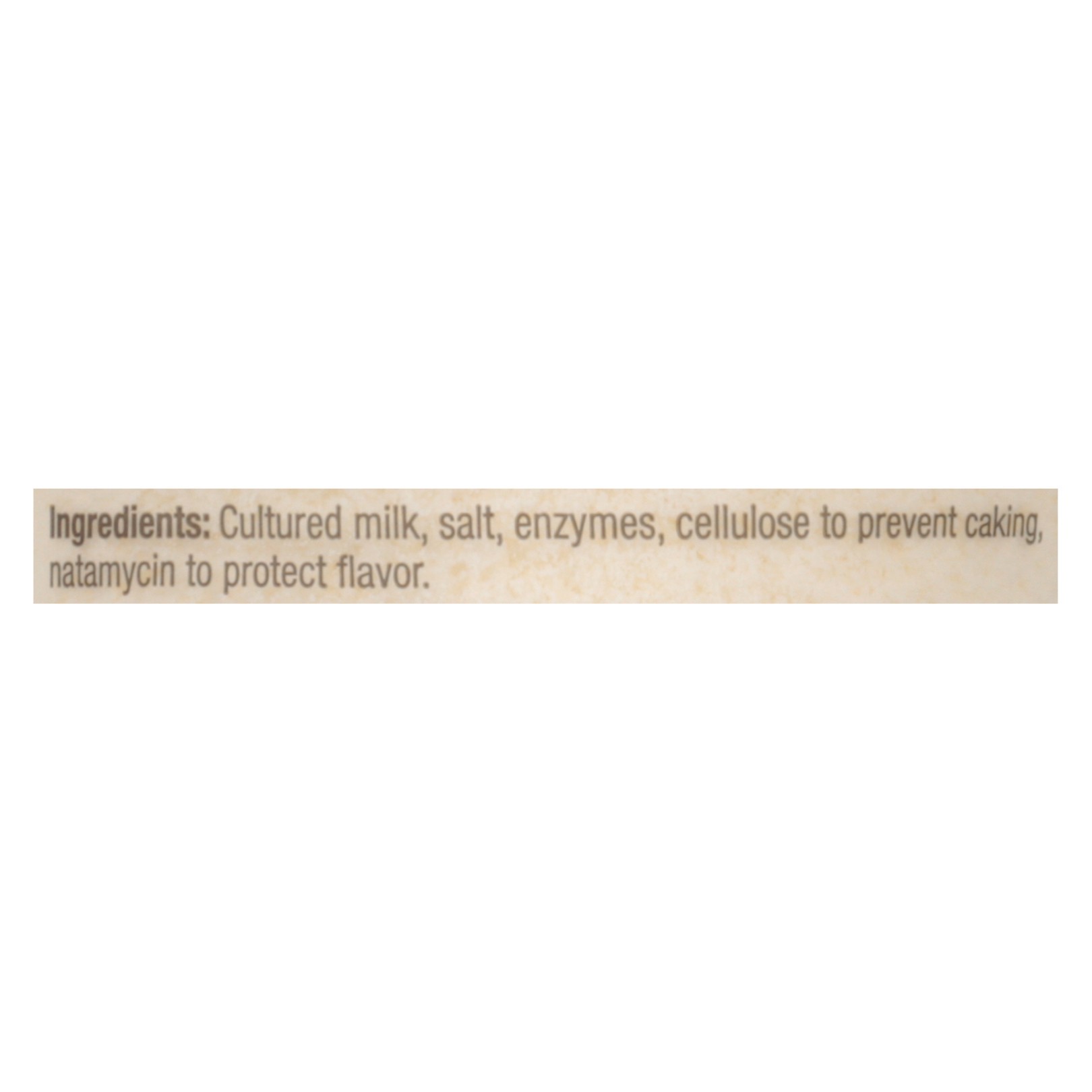 Cultured Milk, Salt, Enzymes, Cellulose to Prevent Caking Natamycin to Protect Flavor.