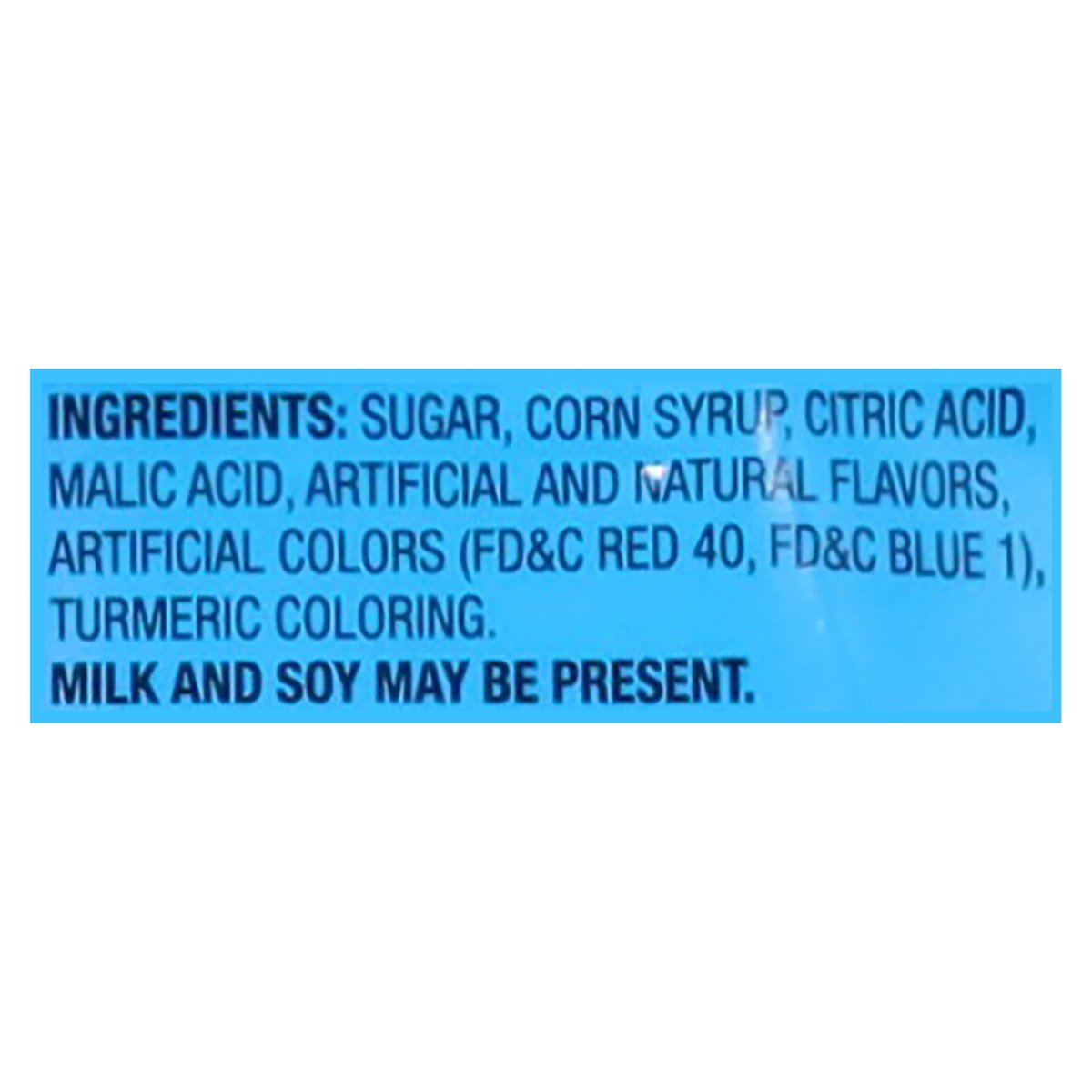 Sugar, Corn Syrup, Citric Acid, Malic Acid, Artificial and Natural Flavors, Artificial Colors (FD&C Red 40, FD&C Blue 1), Turmeric Coloring.