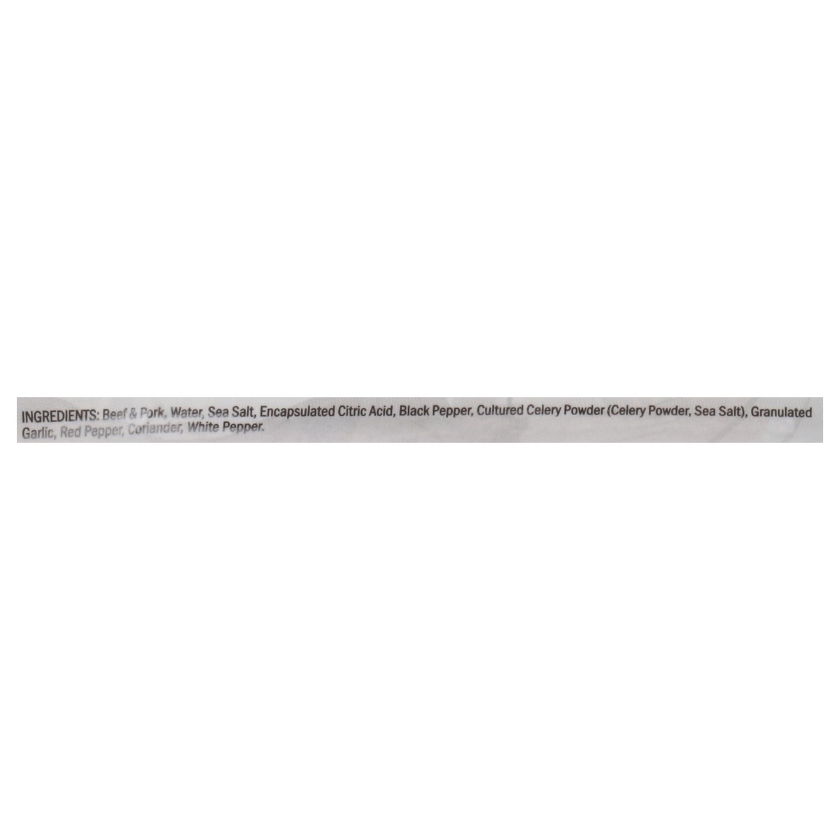 Beef & Pork, Water, Sea Salt, Encapsulated Citric Acid, Black Pepper, Cultured Celery Powder (Celery Powder, Sea Salt), Granulated Garlic, Red Pepper, Coriander, White Pepper. Encased in Beef Collagen…