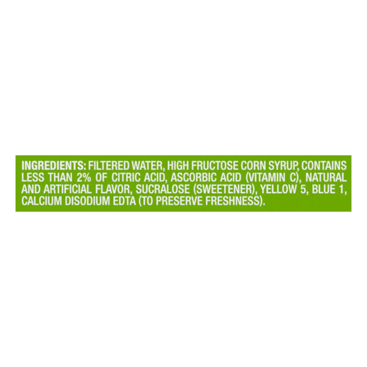 FILTERED WATER, HIGH FRUCTOSE CORN SYRUP, CONTAINS LESS THAN 2% OF CITRIC ACID, ASCORBIC ACID (VITAMIN C), NATURAL AND ARTIFICIAL FLAVOR, SUCRALOSE (SWEETENER),YELLOW 5, BLUE 1, CALCIUM DISODIUM EDTA …