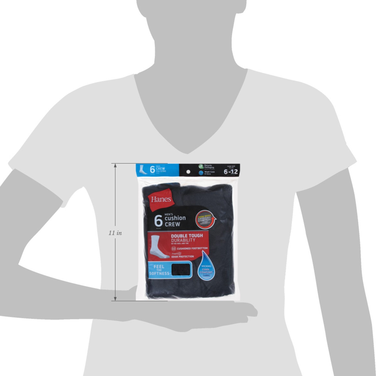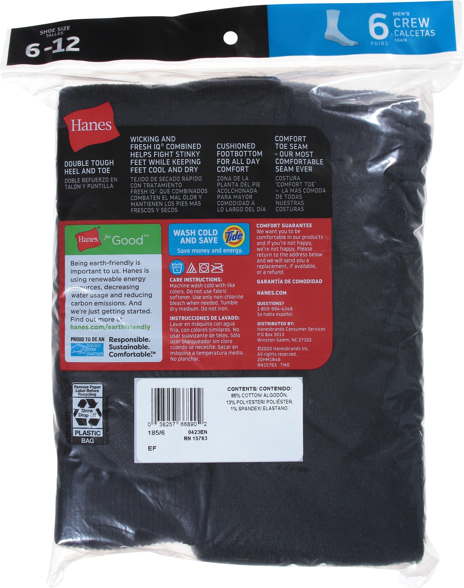 Hanes Mens Socks Cushion Crew Black Size 10 To 13 - 6 Count