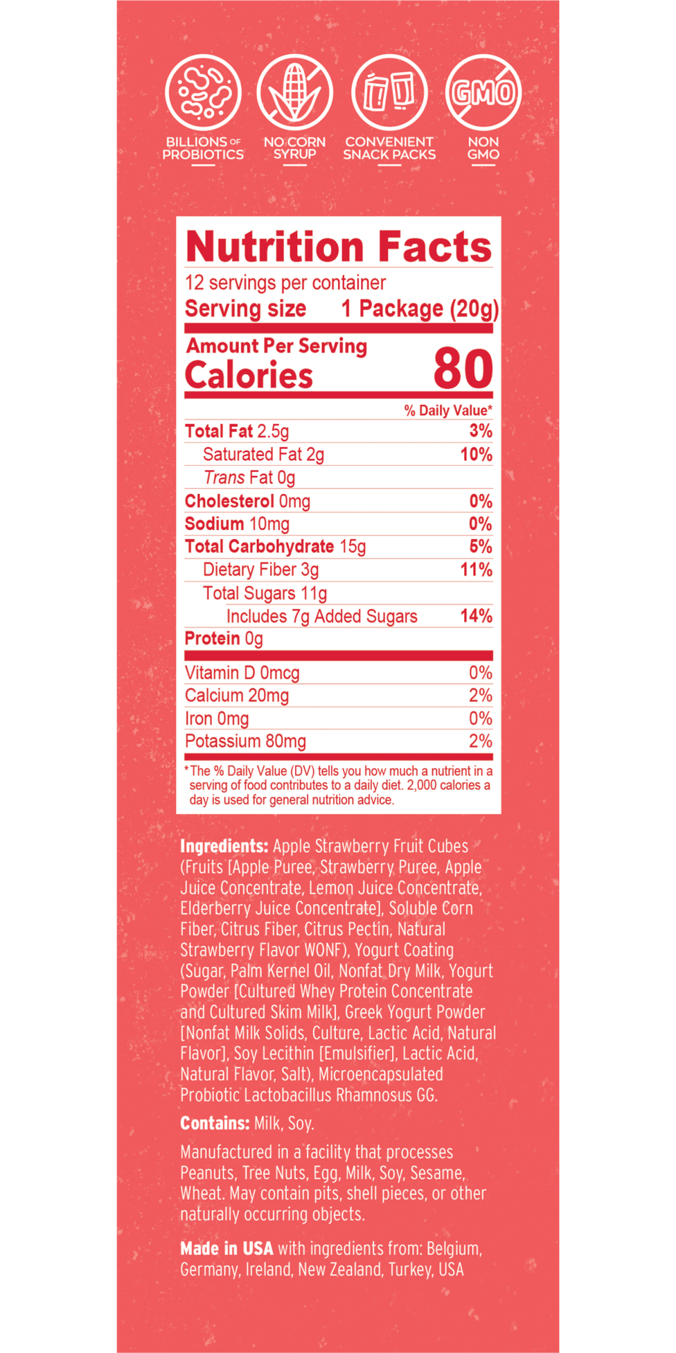 Apple Strawberry Fruit Cubes (Fruits [Apple Puree, Strawberry Puree, Apple Juice Concentrate, Lemon Juice Concentrate, Elderberry Juice Concentrate], Soluble Corn Fiber, Citrus Fiber, Citrus Pectin, N…