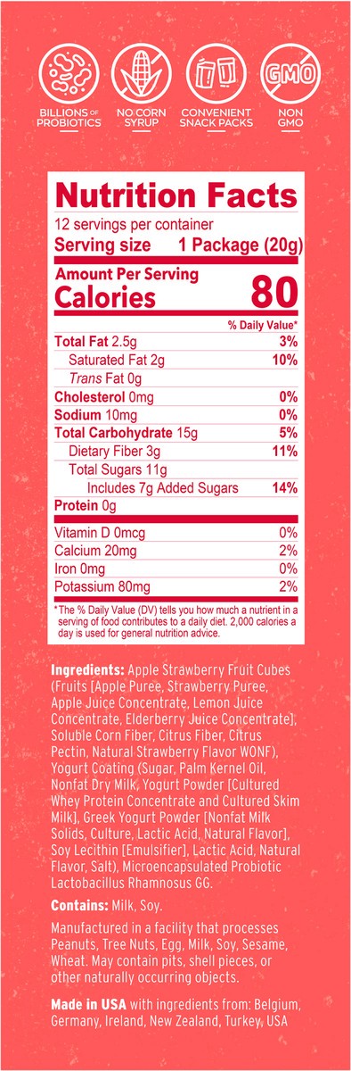 Apple Strawberry Fruit Cubes (Fruits [Apple Puree, Strawberry Puree, Apple Juice Concentrate, Lemon Juice Concentrate, Elderberry Juice Concentrate], Soluble Corn Fiber, Citrus Fiber, Citrus Pectin, N…