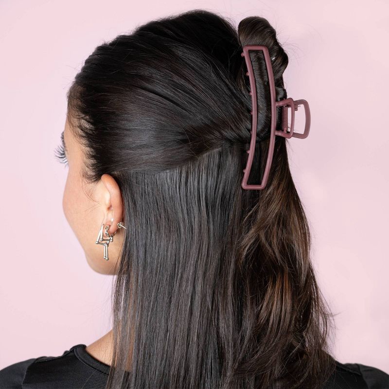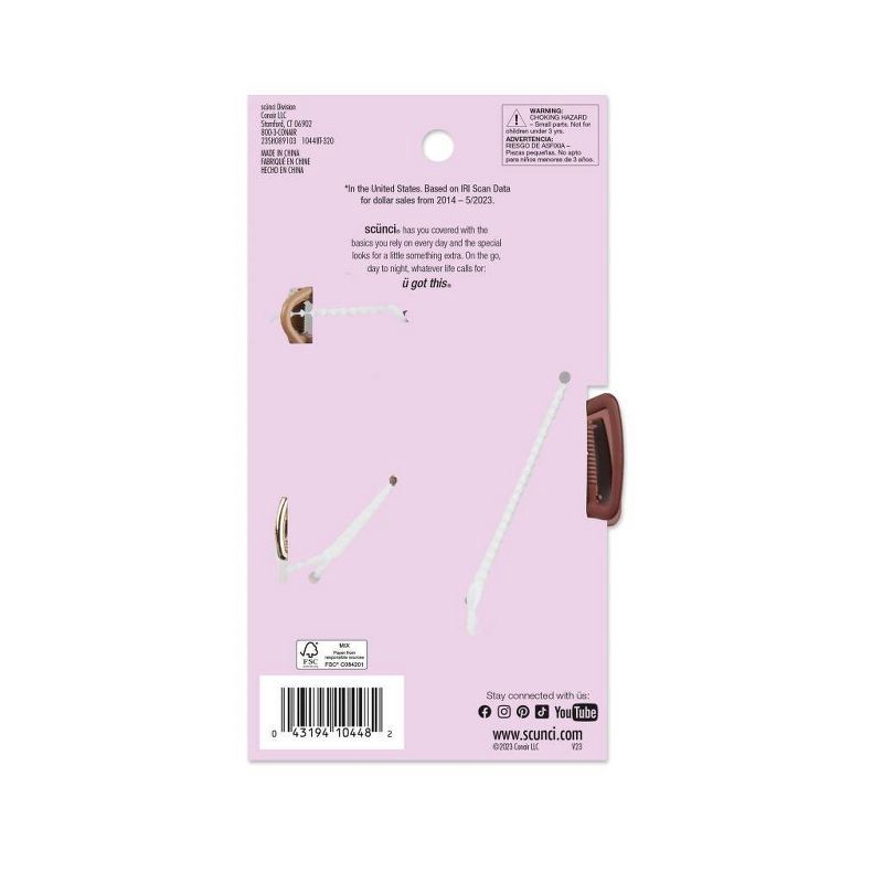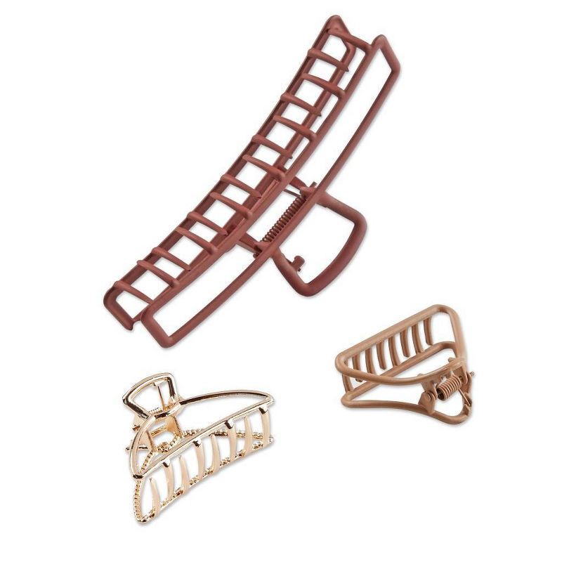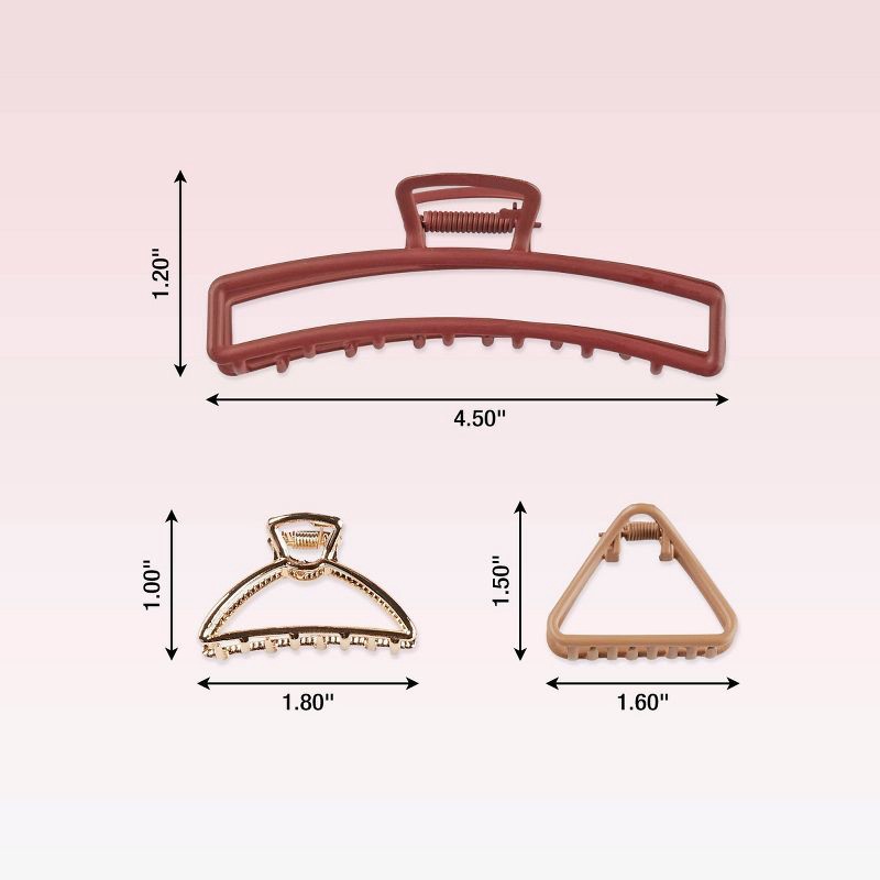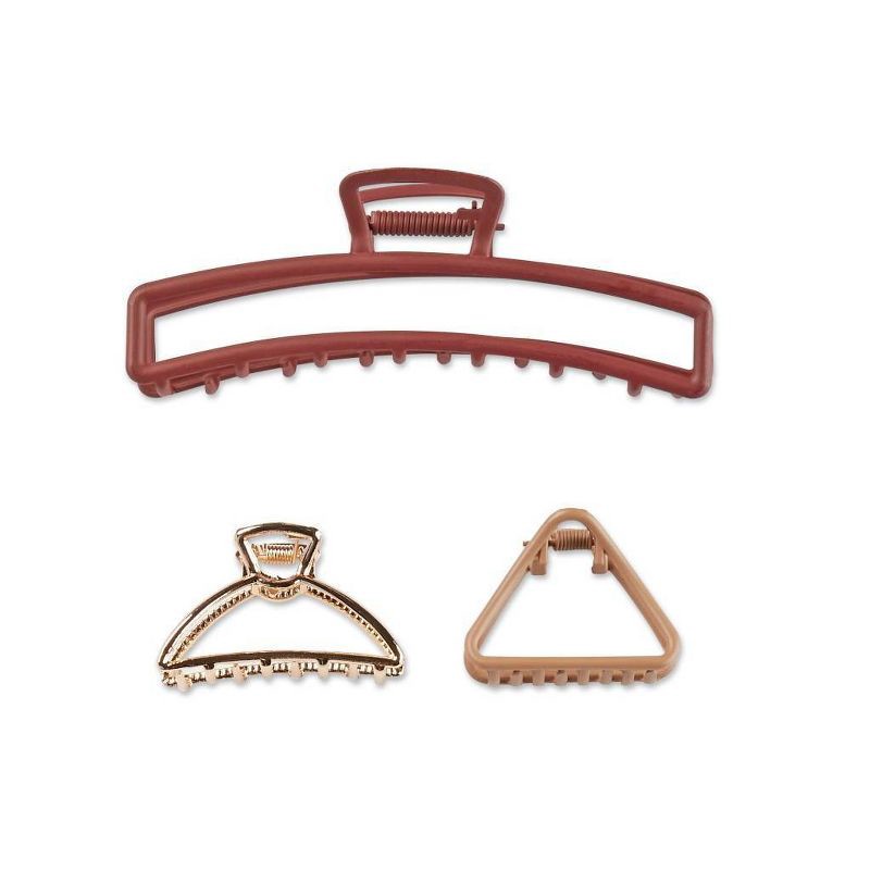 Lock in a twist, bun, or small section of hair with stylish, open-cut metal claw clips from scünci®. Three metal clips—one large, curved red; one medium, rounded gold, and one triangular brown clip—ha…