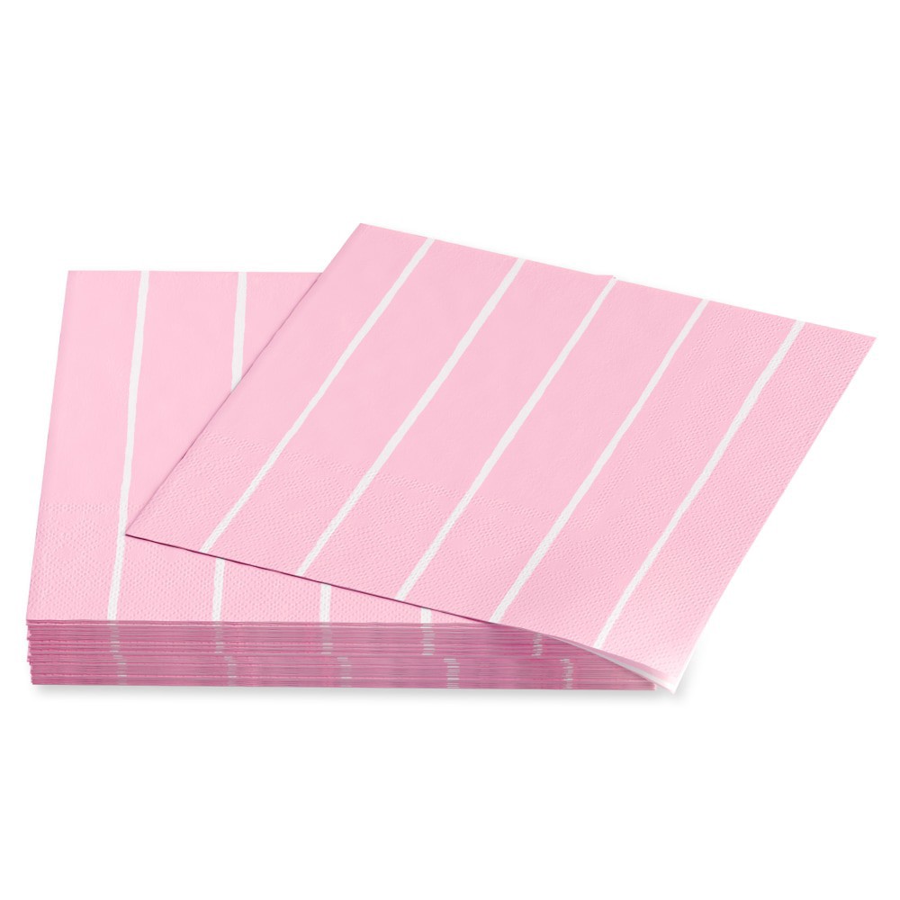 - Lunch napkins are 2-ply and white vertical lines on a light pink background.