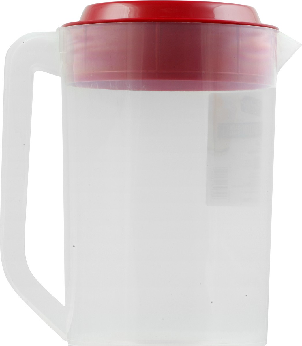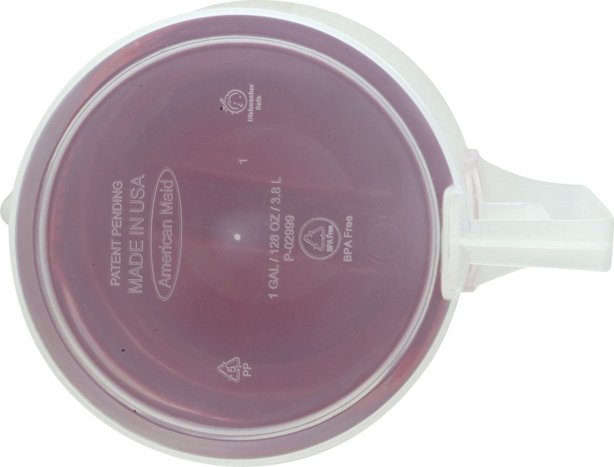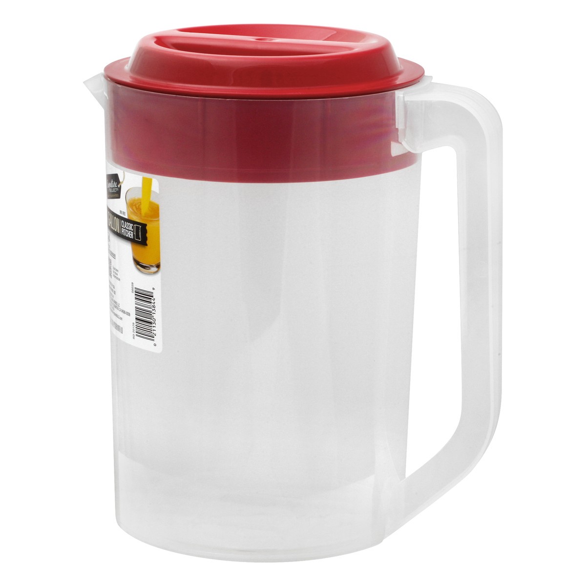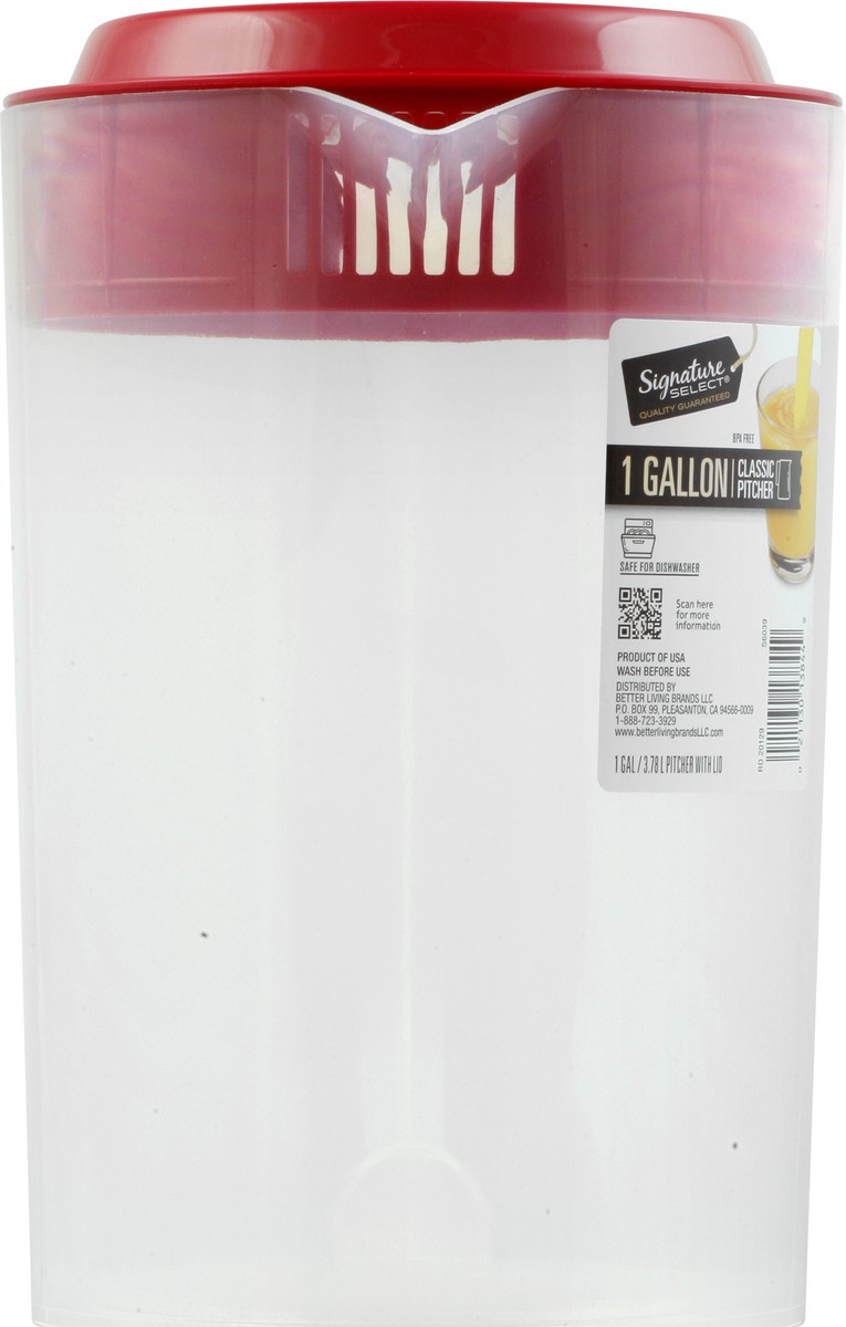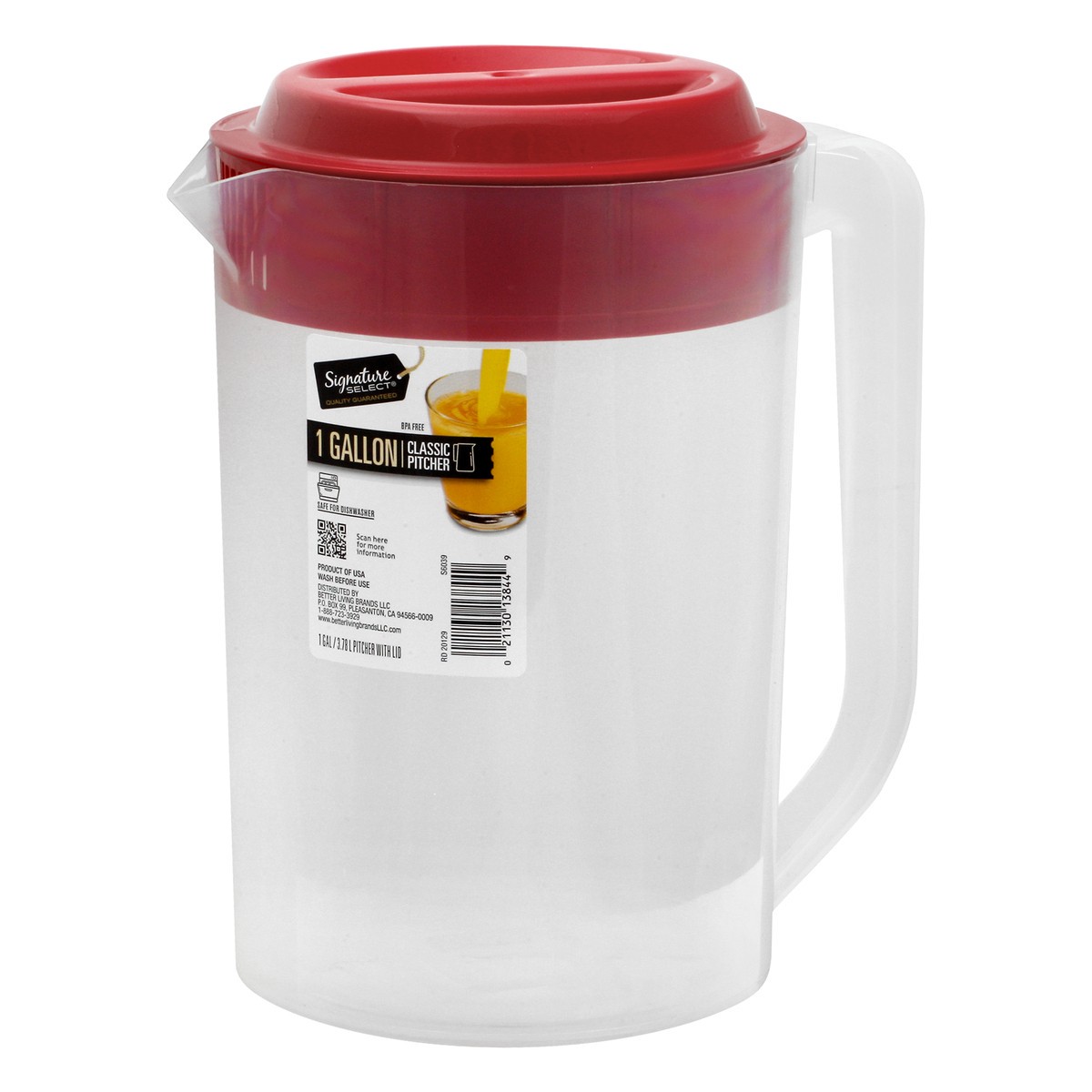 1 gal / 3.78 l pitcher with lid. Safe for dishwasher. www.betterlivingbrandsLLC.com. Scan for more information. BPA free. Product of USA.