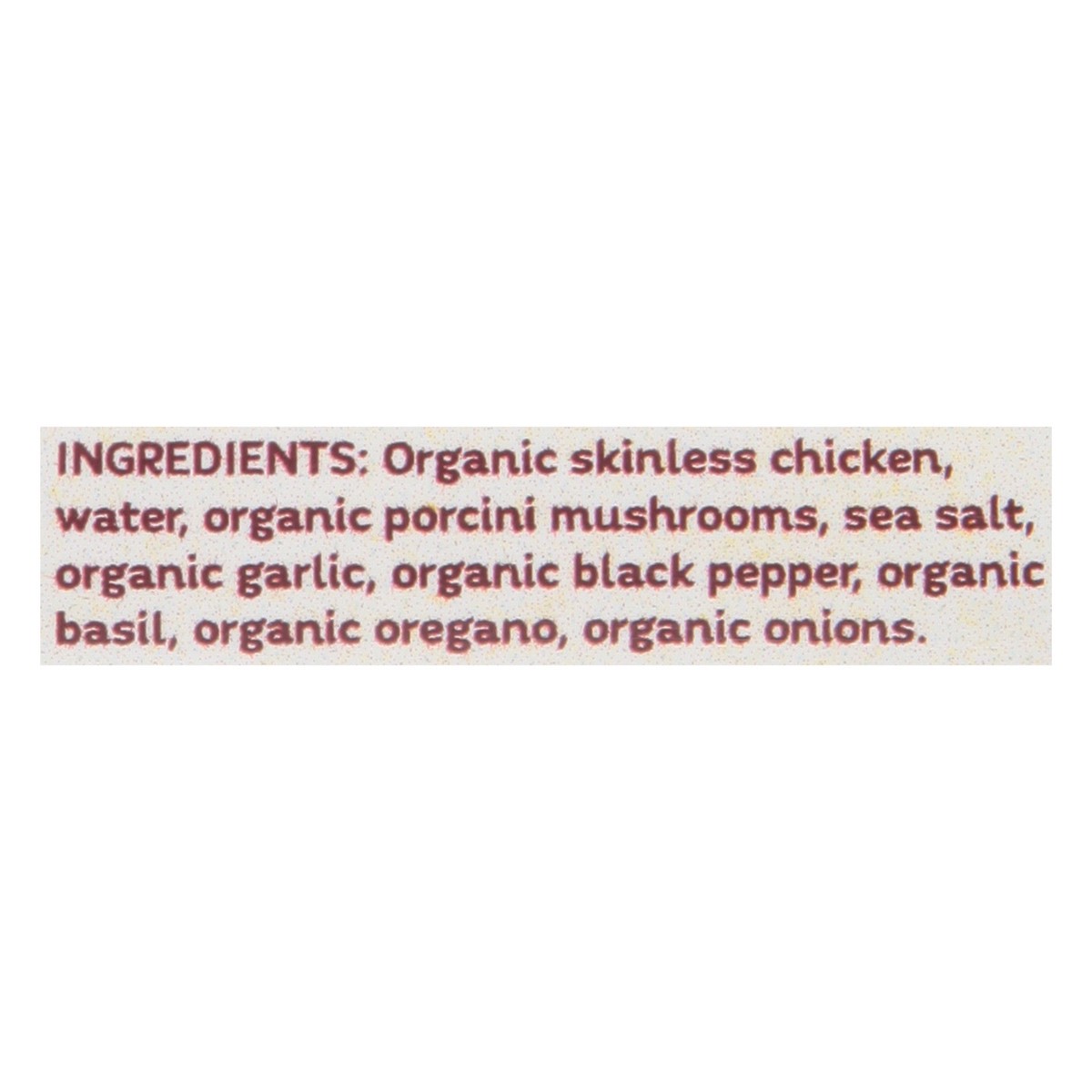 Organic Skinless Chicken, Water, Organic Porcini Mushrooms, Sea Salt, Organic Garlic, Organic Black Pepper, Organic Basil, Organic Oregano, Organic Onions.