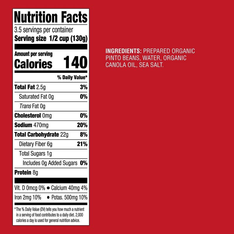 PREPARED ORGANIC PINTO BEANS, WATER, ORGANIC CANOLA OIL, SEA SALT.