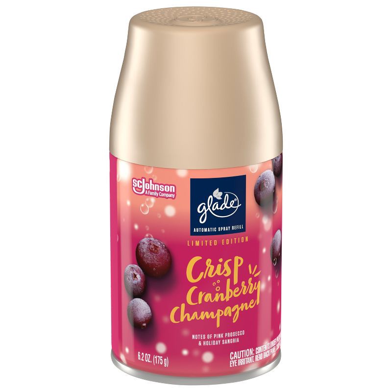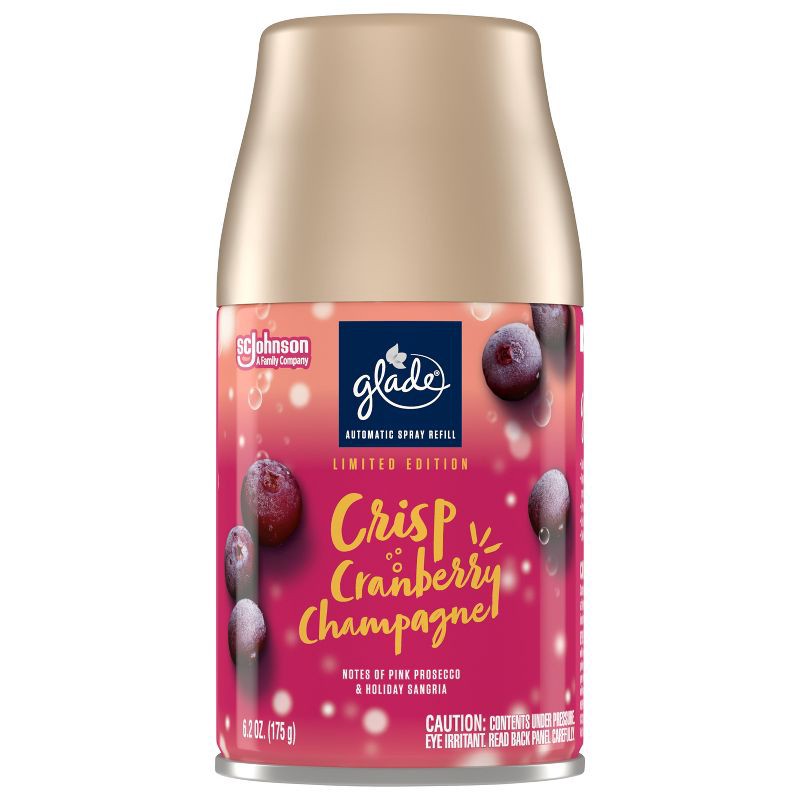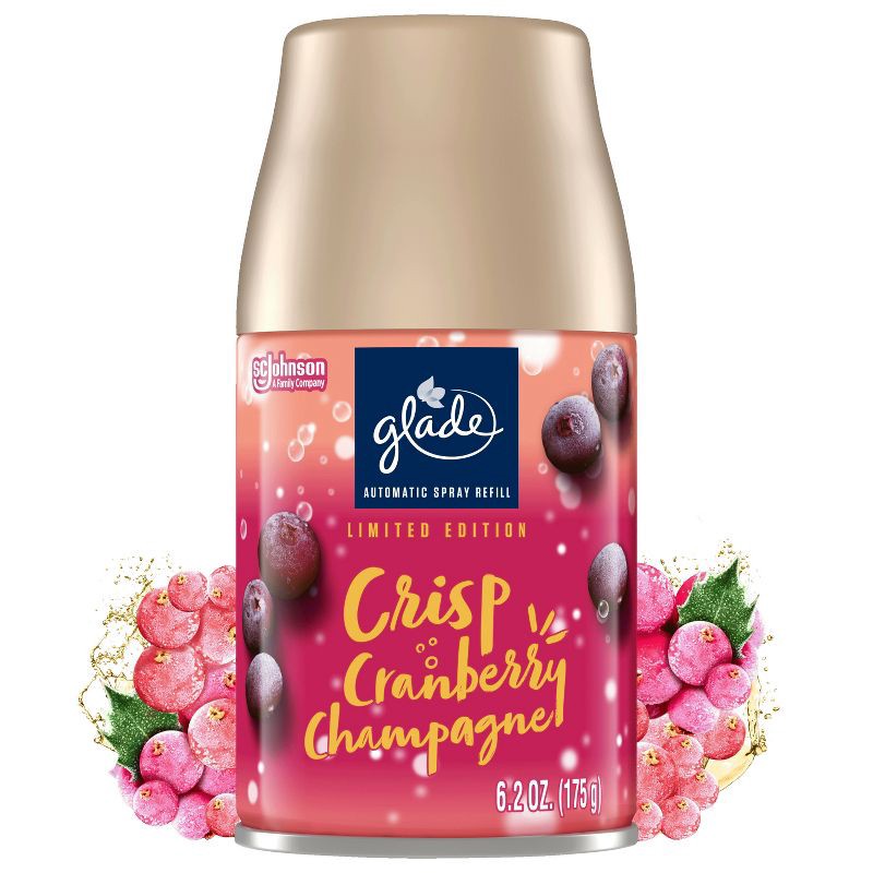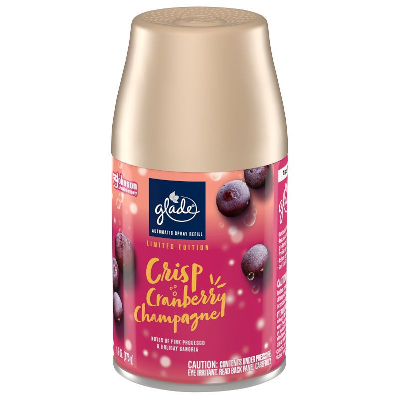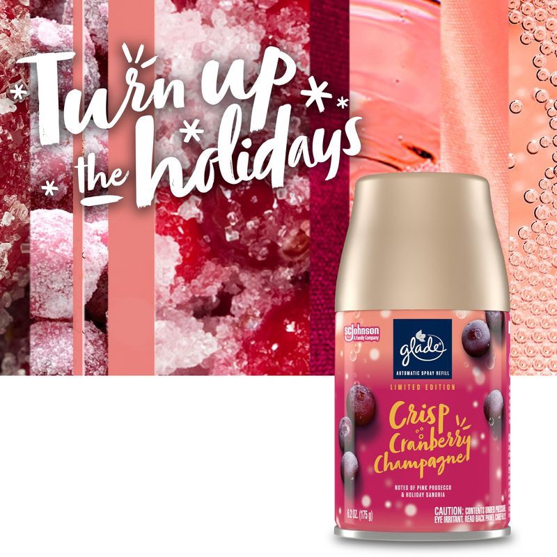 Turn up the holidays with Glade Crisp Cranberry Champagne automatic air freshener for home use. This limited edition automatic spray air freshener is a great way to add a layer of luxurious comfort wi…