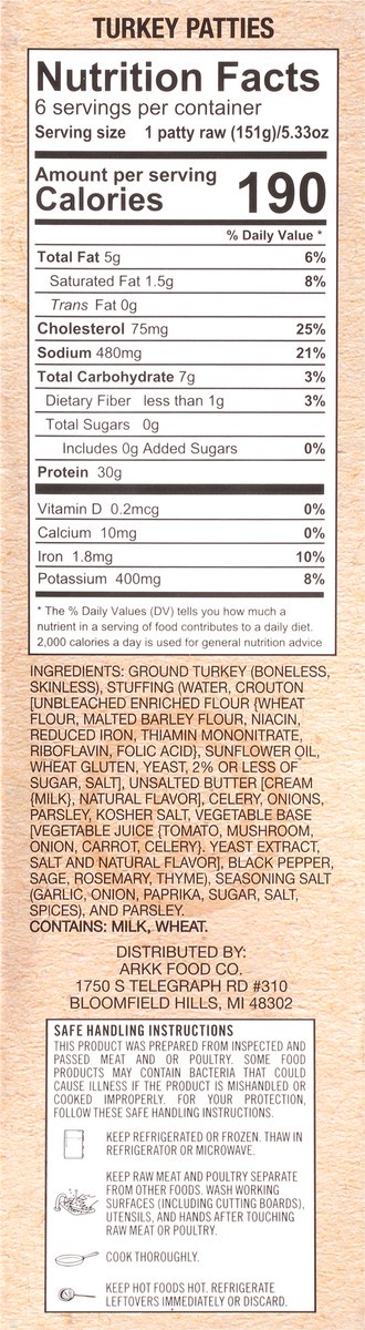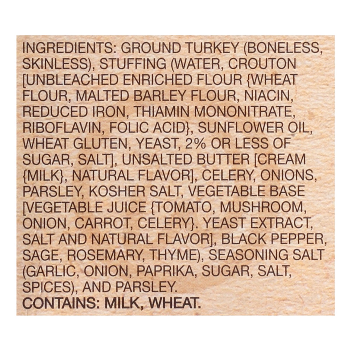 Ground Turkey (Boneless, Skinless), Stuffing (Water, Crouton [Unbleached Enriched Flour (Wheat Flour, Malted Barley Flour, Niacin, Reduced Iron, Thiamin Mononitrate, Riboflavin, Folic Acid), Sunflower…