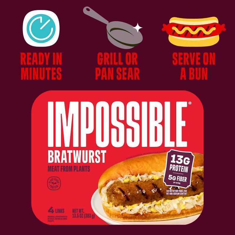 The star of summer BBQs and every tailgate ever is now even more awesome thanks to plants. Before you ask…yes, Impossible™ Bratwurst has a snap, sizzle and flavor you'll love, plus 13 g of protein, 5 …