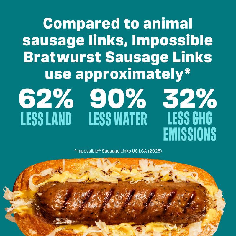 - Every time you eat an Impossible Bratwurst link instead of the animal version, you use 79% less water and generate 71% less GHG emissions (Impossible Foods LCA, ISO compliant; EY, 2019)