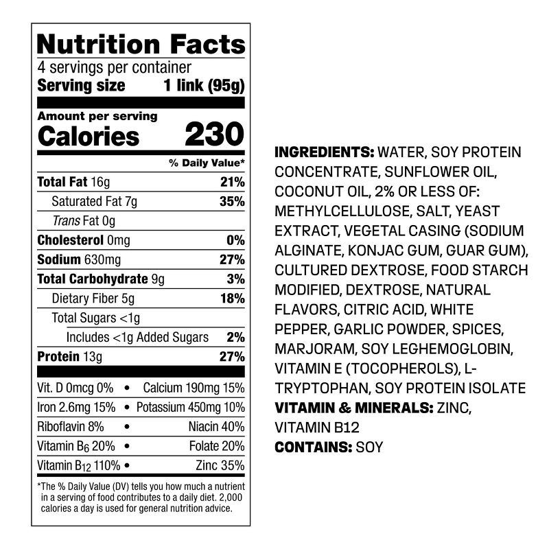 Water, Soy Protein Concentrate, Sunflower Oil, Coconut Oil, 2% Or Less Of: Methylcellulose, Salt, Yeast Extract, Vegetal Casing (Sodium Alginate, Konjac Gum, Guar Gum), Cultured Dextrose, Food Starch …