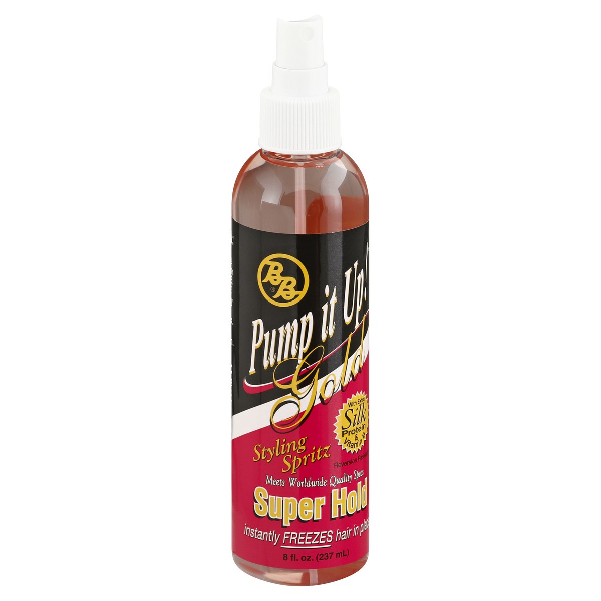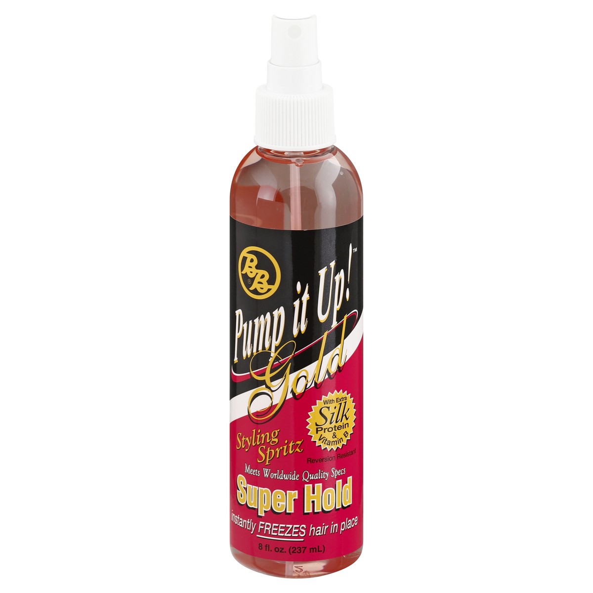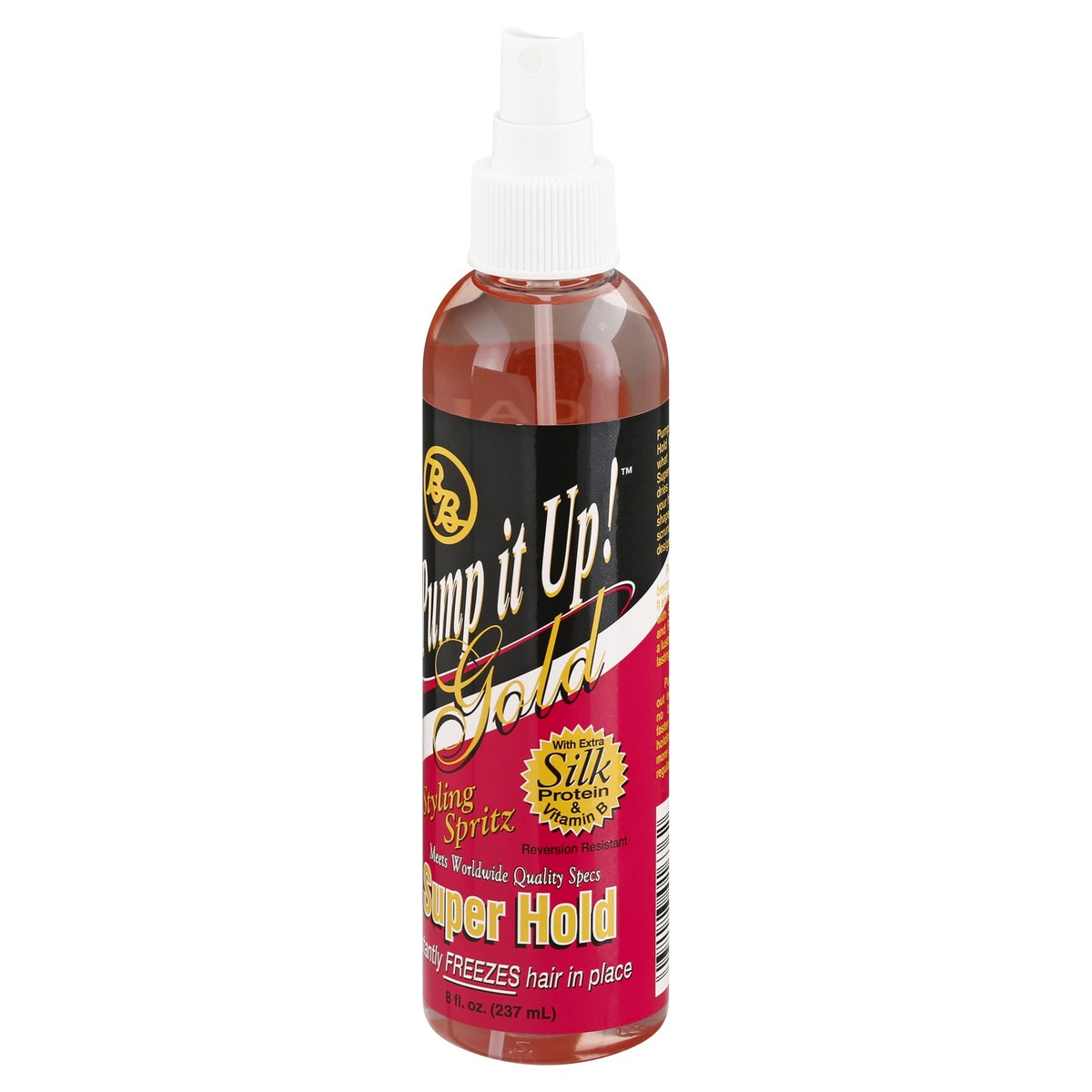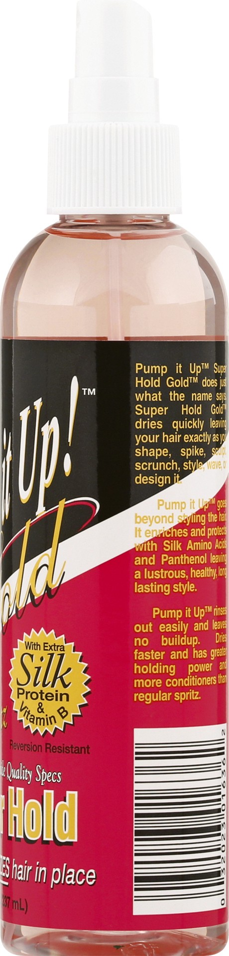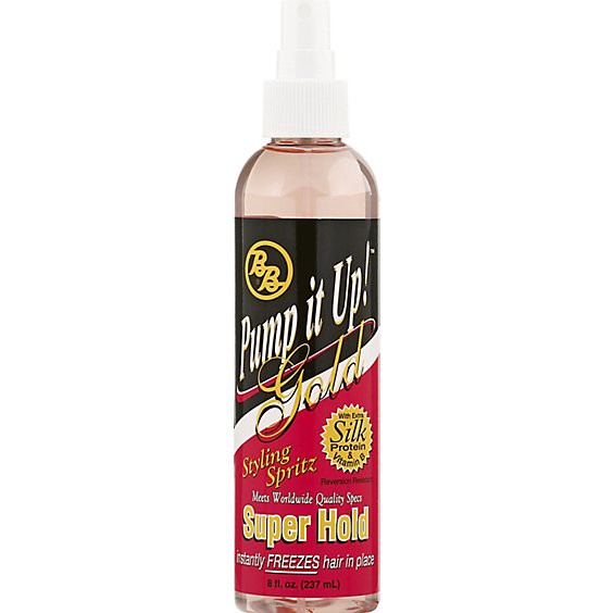 With extra silk protein & vitamin B. Reversion resistant. Meets Worldwide quality specs. Super hold. Instantly freezes hair in place. Pump it Up Super Hold Gold does just what the name says. Super Hol…