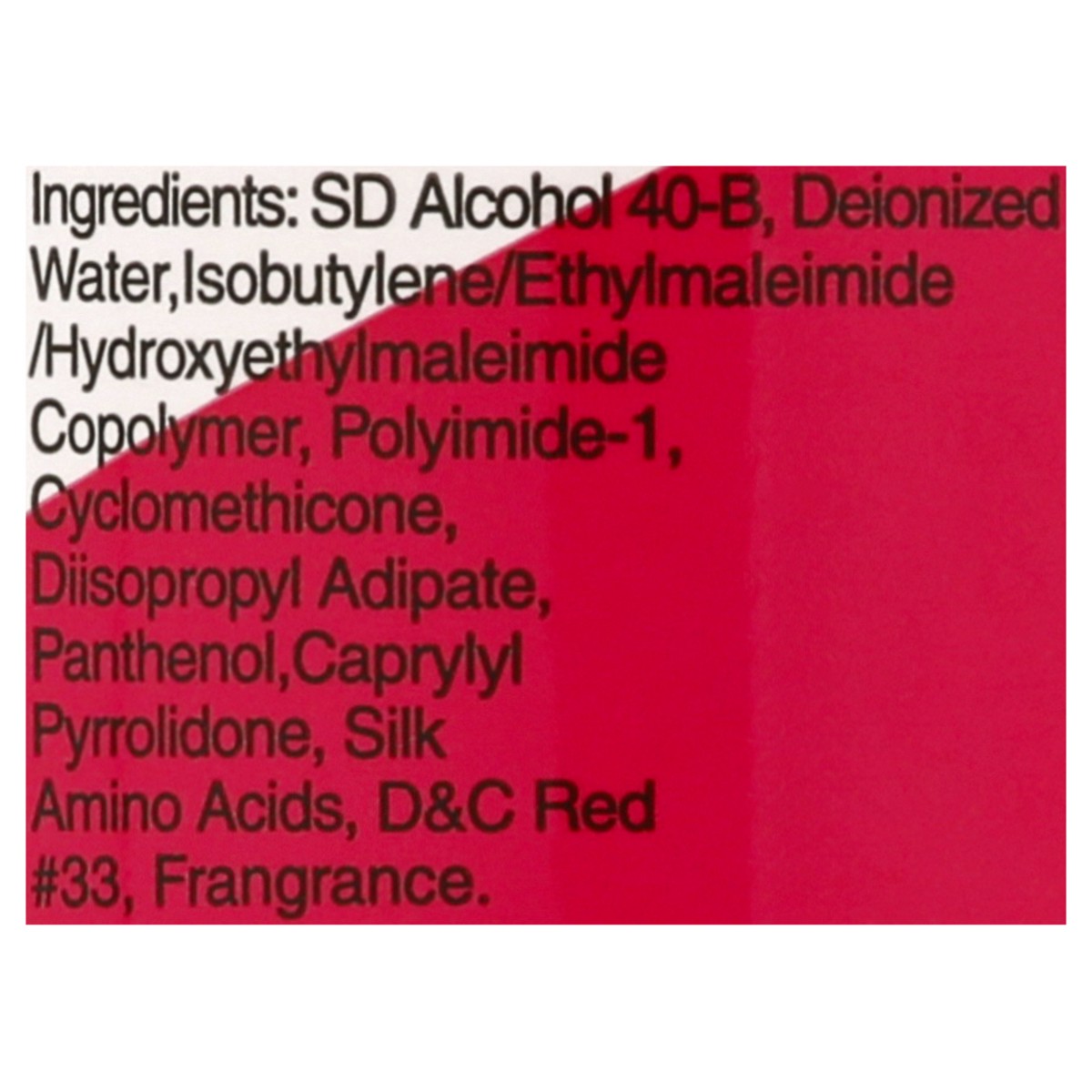 SD Alcohol 40-B, Deionized Water, Isobutylene/Ethlmaleimide/Hydroxyethylmaleimide Copolymer, Polymide-1, Cyclomethicone, Diisopropyl Adipate, Panthenol, Caprylyl Pyrrolidone, Silk Amino Acids, D&C Red…