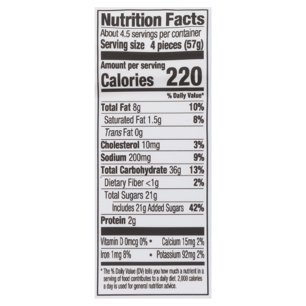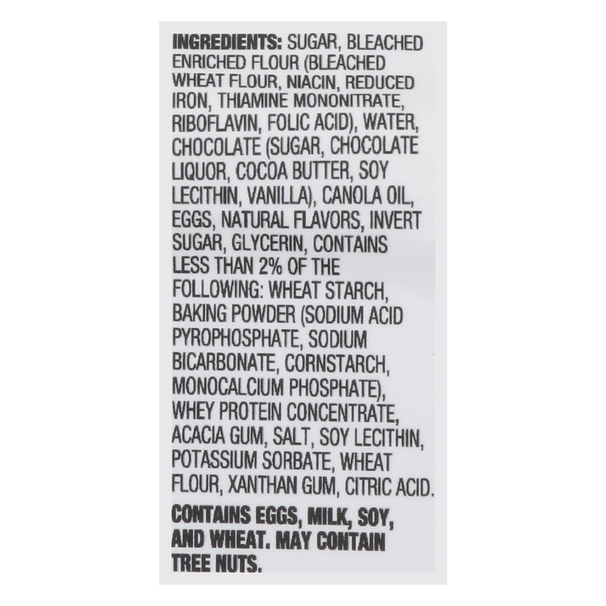 Sugar, Bleached Enriched Flour (Bleached Wheat Flour, Niacin, Reduced Iron, Thiamine Mononitrate, Riboflavin, Folic Acid), Water, Chocolate (Sugar, Chocolate Liquor, Cocoa Butter, Soy Lecithin, Vanill…