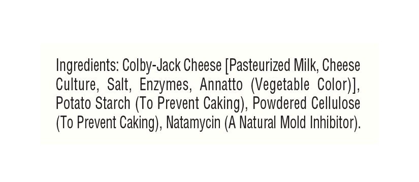 Colby-Jack Cheese [Pasteurized Milk, Cheese Culture, Salt, Enzymes, Annatto (Vegetable Color)], Potato Starch (to Prevent Caking), Powdered Cellulose (to Prevent Caking), Natamycin (a Natural Mold Inh…