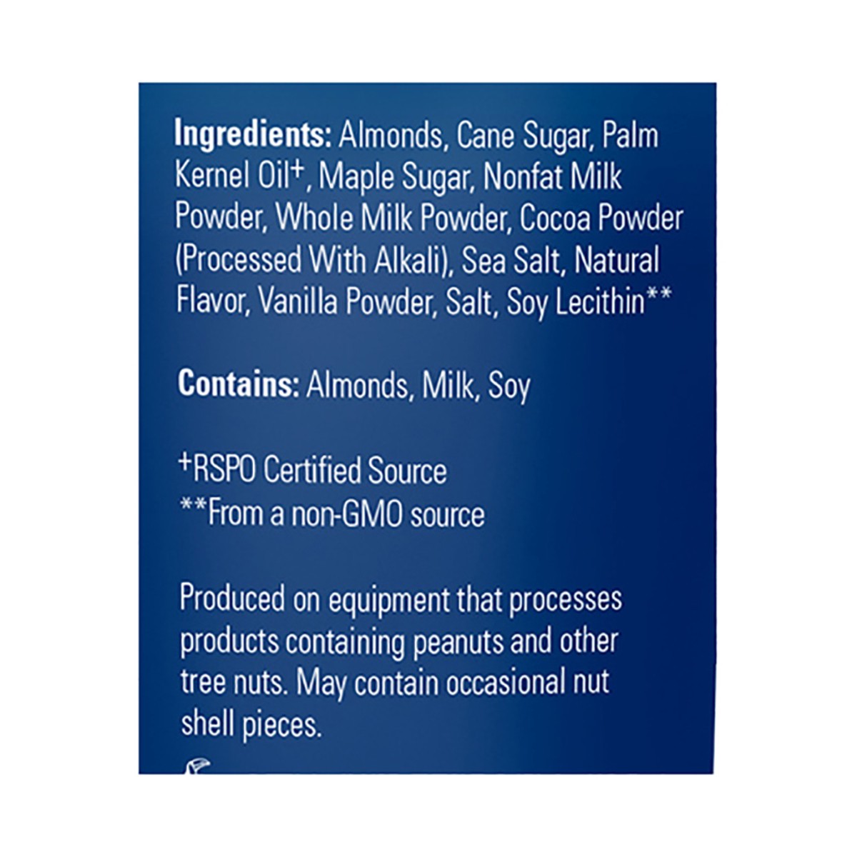 Contains: almonds, milk, soy. produced on equipment that processes products containing peanuts and other tree nuts.