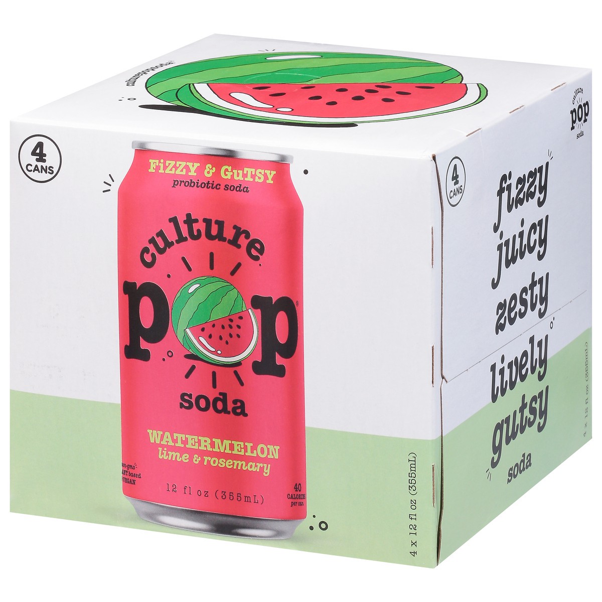 Fizzy & gutsy. Plant-based. Soda you can feel good about! Fizzy, juicy, zesty, lively, gusty soda.
