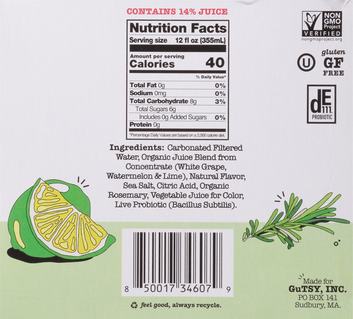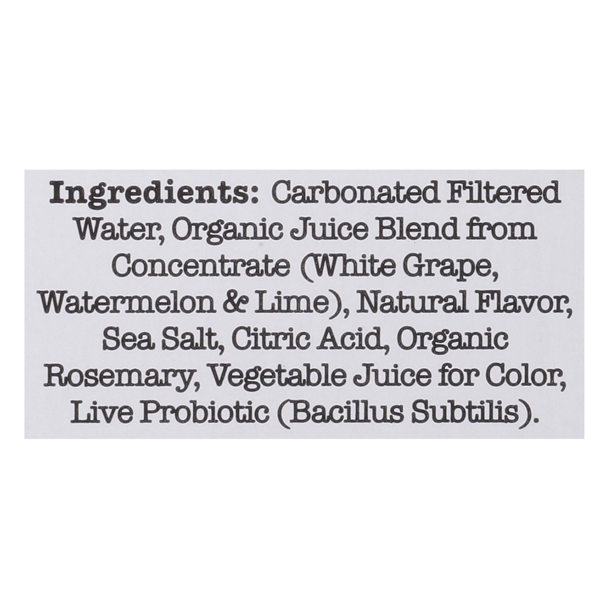 Carbonated Filtered Water, Organic Juice Blend from Concentrate (White Grape, Watermelon & Lime), Natural Flavor, Sea Salt, Citric Acid, Organic Rosemary, Vegetable Juice for Color, Live Probiotic (Ba…