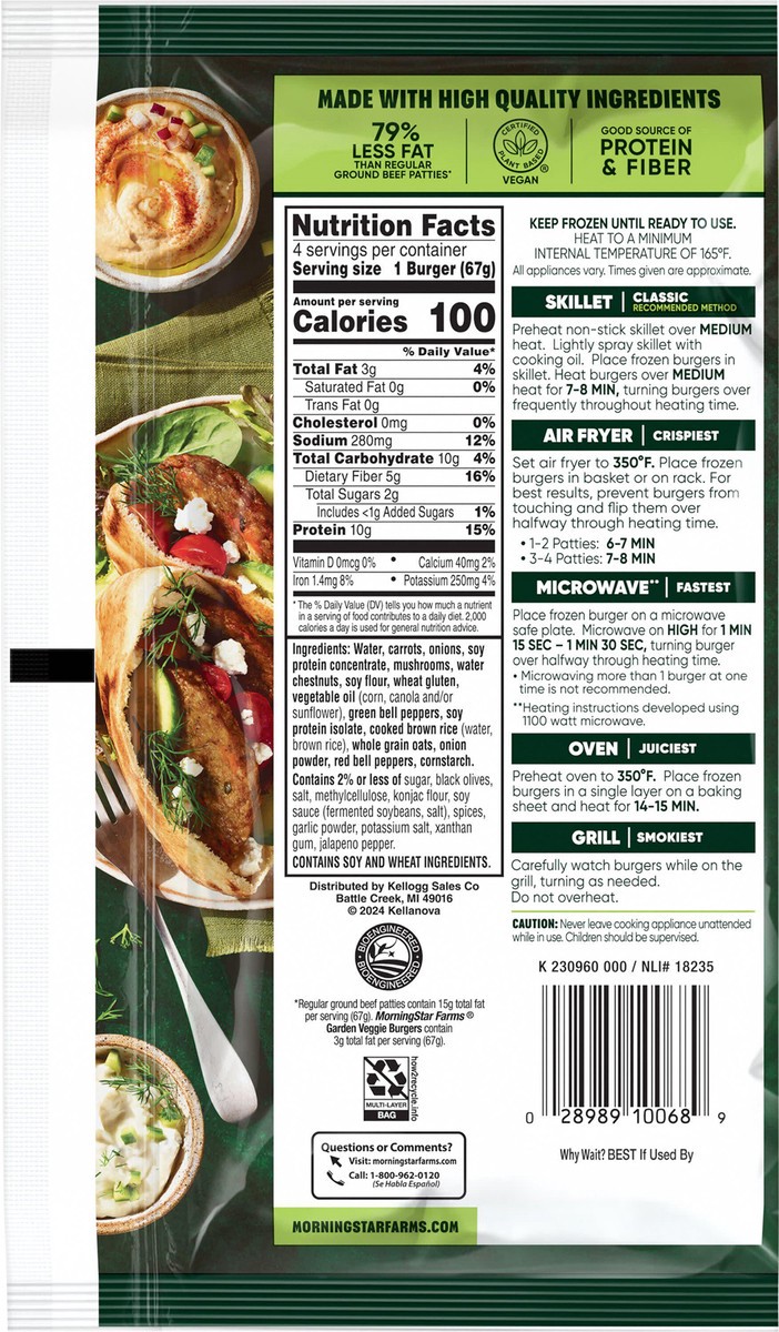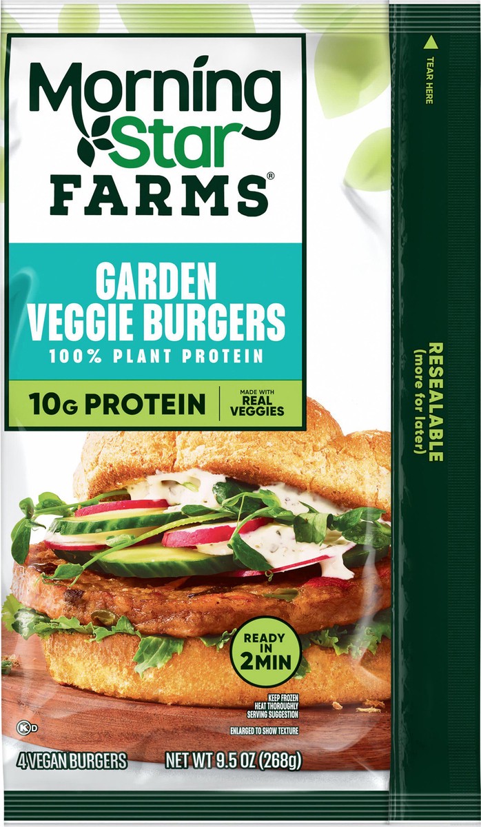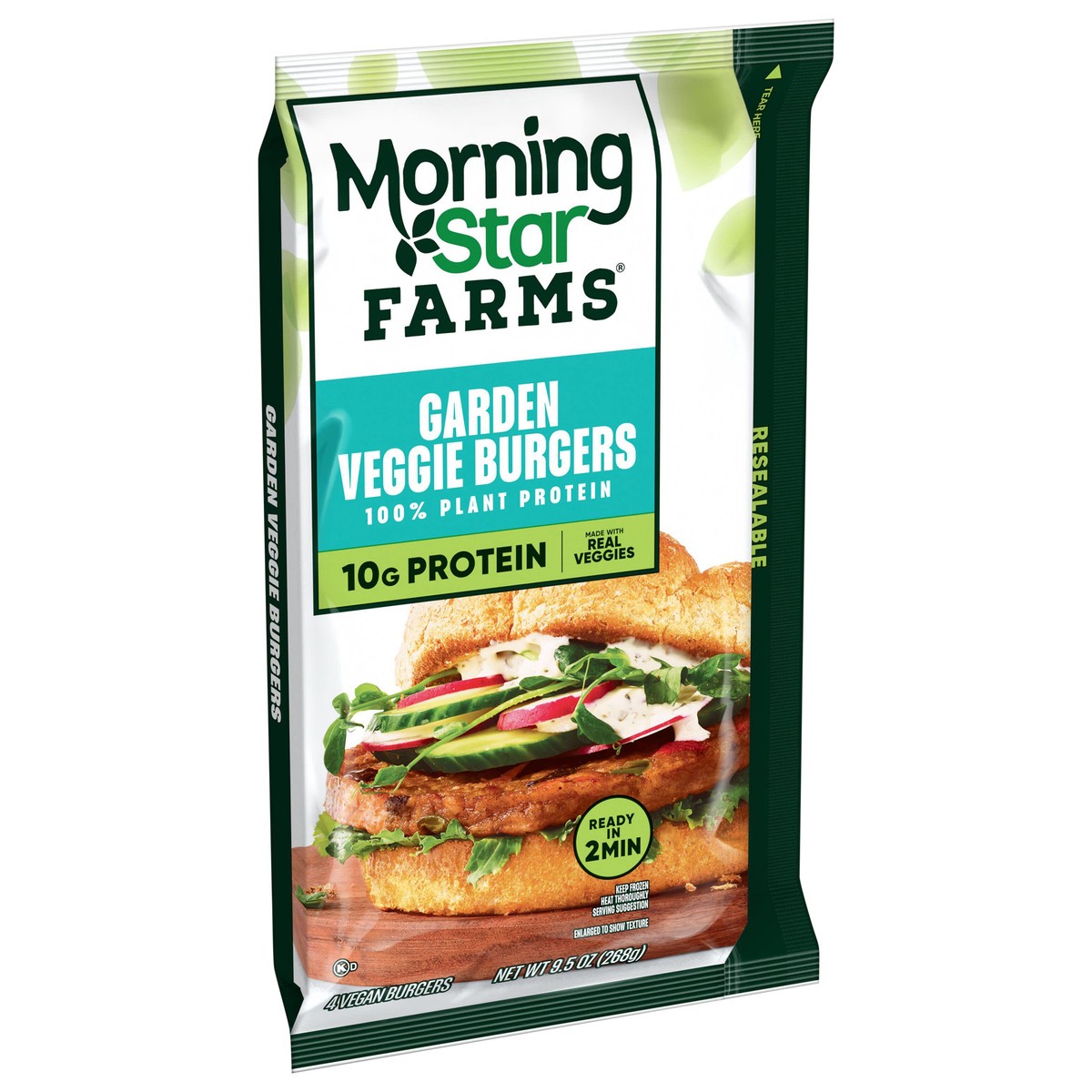 MorningStar Farms Garden Veggie vegan burgers are made with a savory blend of delicious vegetables for bold flavor and pleasing texture in every bite. With 79% less fat than regular ground beef pattie…