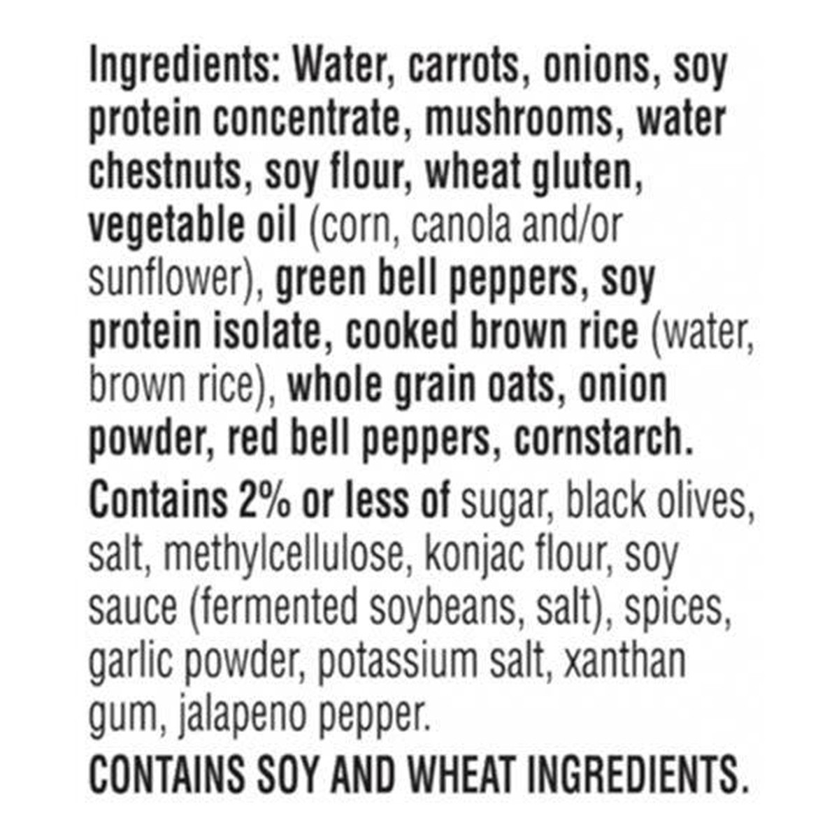 Water, Carrots, Onions, Soy Protein Concentrate, Mushrooms, Water Chestnuts, Soy Flour, Wheat Gluten, Vegetable Oil (Corn, Canola and/or Sunflower), Green Bell Peppers, Soy Protein Isolate, Cooked Bro…