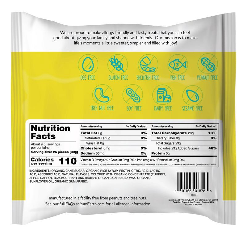 ingredients: organic cane sugar, organic rice syrup, pectin, citric acid, lactic acid, ascorbic acid, natural flavors, colored with organic concentrate (pumpkin, apple, carrot, blackcurrant and radish…
