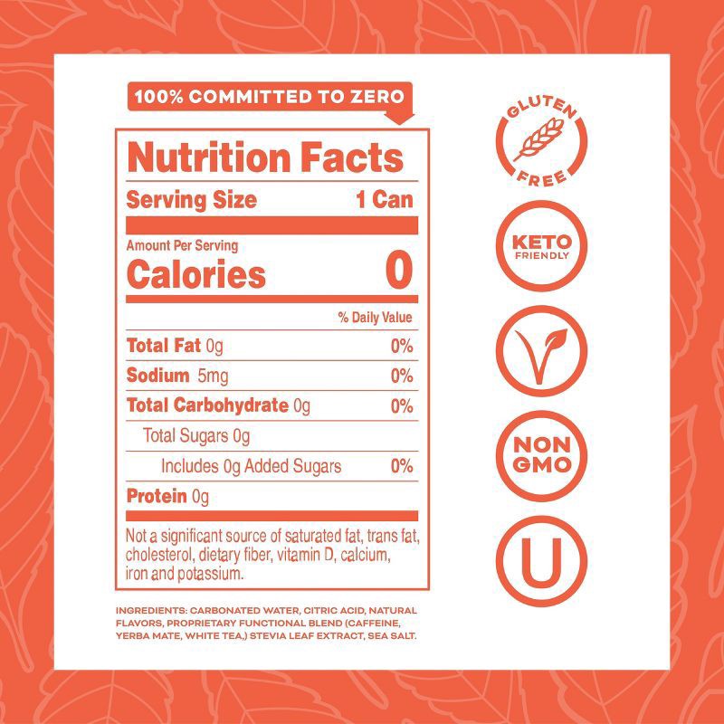 CARBONATED WATER, NATURAL FLAVORS, CITRIC ACID, PROPRIETARY FUNCTIONAL BLEND (YERBAE MATE, WHITE TEA, CAFFEINE), STEVIA LEAF EXTRACT, SEA SALT.