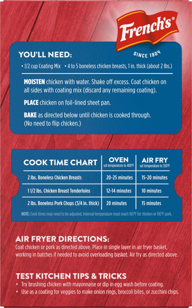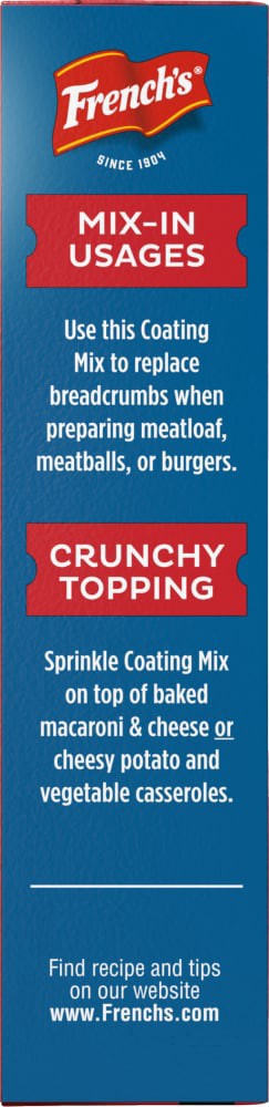 Shake up everyday meals with French's Seasoned Coating Mix Crispy Fried Onion. Made with ingredients including breadcrumbs, French's Crispy Fried Onions, and garlic powder and paprika, this seasoned c…