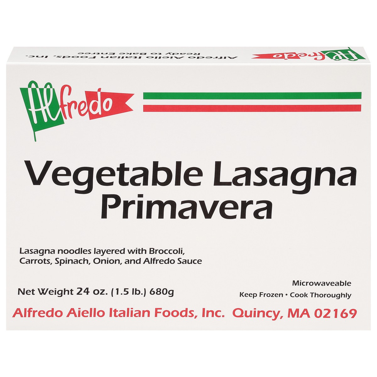 Microwaveable. Cook thoroughly. Ready to bake entree. Lasagna noodles layered with broccoli, carrots, spinach, onion, and alfredo sauce. Let Alfredo's bring a little bit of Italy to your home! Offerin…
