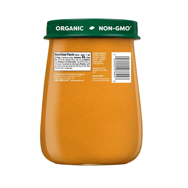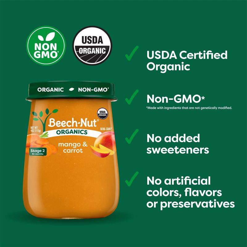 - Beech-Nut's deliciously pureed organic mango & carrot baby food features a smooth texture for baby