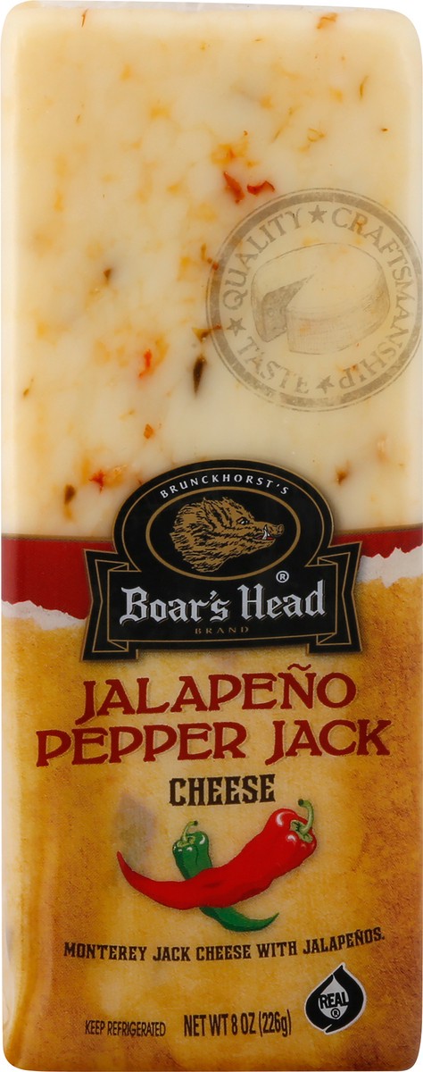 Blended with zesty red and green jalapeño peppers and aged to perfection, this buttery, slightly tart, semi-soft Monterey Jack cheese packs a flavorful punch. Boar's Head Jalapeño Pepper Jack Cheese i…