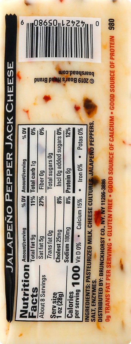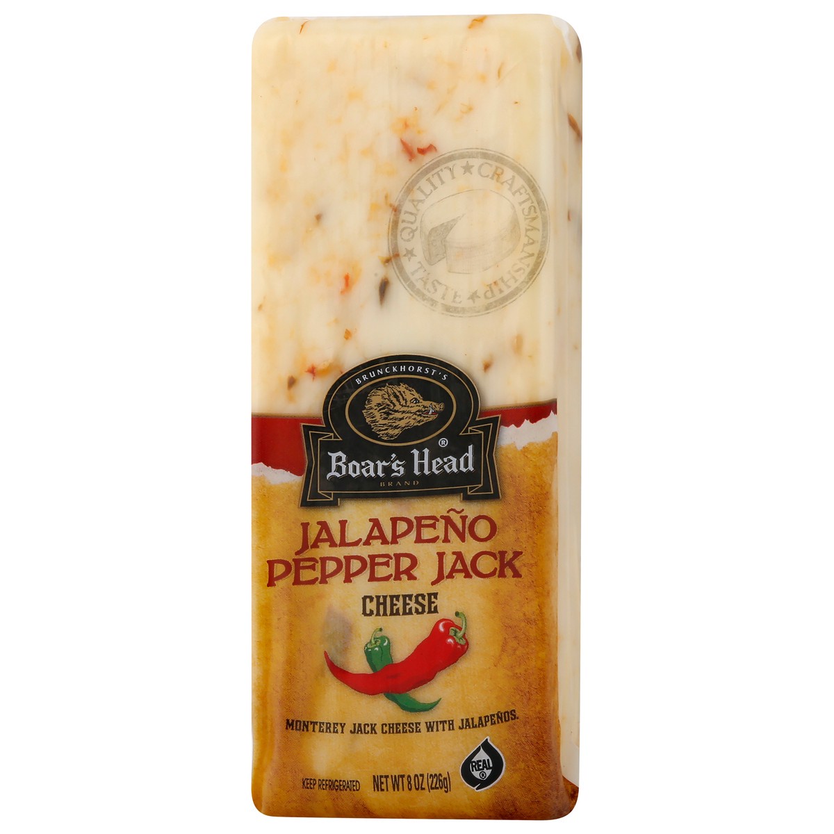 Blended with zesty red and green jalapeño peppers and aged to perfection, this buttery, slightly tart, semi-soft Monterey Jack cheese packs a flavorful punch. Boar's Head Jalapeño Pepper Jack Cheese i…
