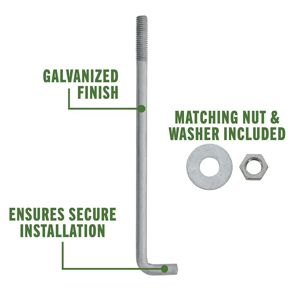 L-shaped design acts as a secure anchoring point in concrete. Common applications include standard buildings, foundations and basketball poles.. Includes a nut and washer for strong, secure installati…