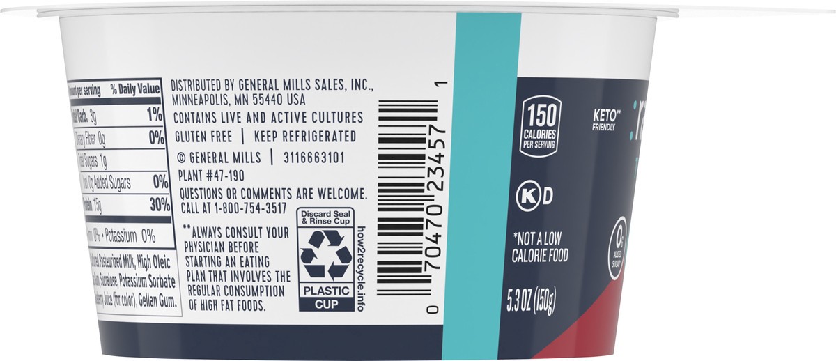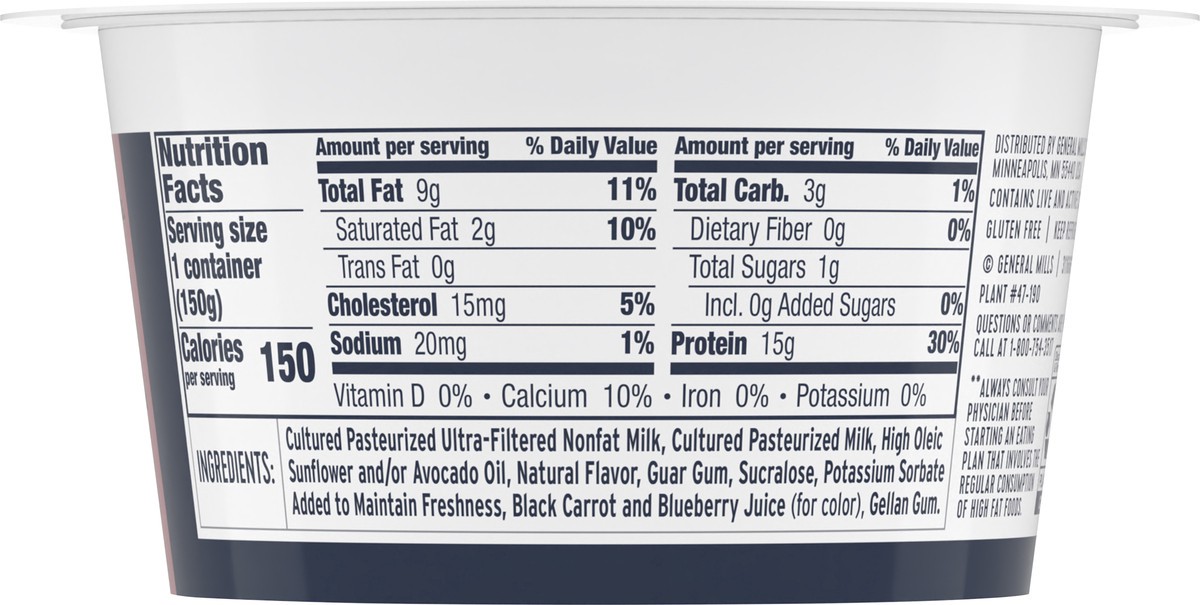 Cultured Pasteurized Ultra-Filtered Nonfat Milk, Cultured Pasteurized Milk, High Oleic Sunflower and/or Avocado Oil, Natural Flavor, Guar Gum, Sucralose, Potassium Sorbate Added to Maintain Freshness,…