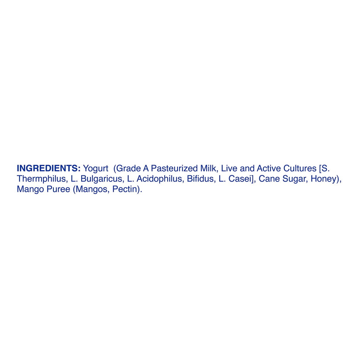 Yogurt (Grade A Pasteurized Milk, Live and Active Cultures [S, Thermphilus, L. Bulgaricus, L. Acidophilus, Bifidus, L. Casei], Cane Sugar, Honey), Mango Puree (Mangos, Pectin).
