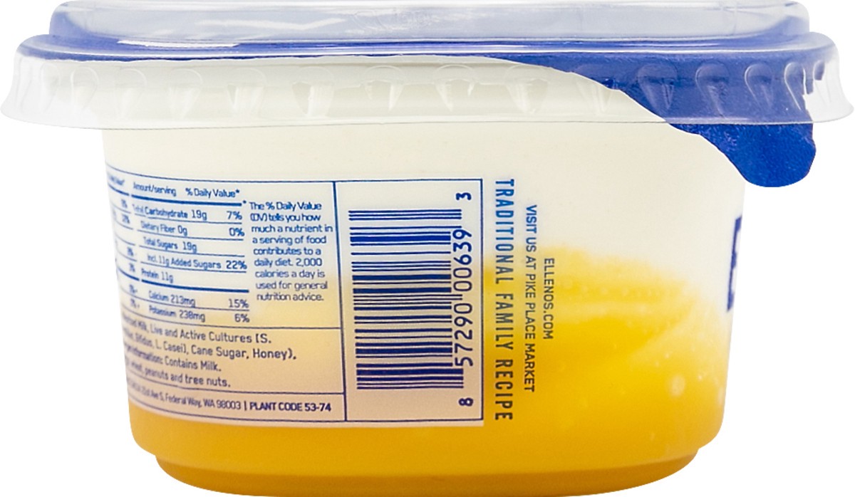 Real Greek yogurt. Traditional family recipe. The above information is accurate as of May 2020, please see packaging for any updated information. Grade A. ellenos.com. Visit us at Pike Place Market.